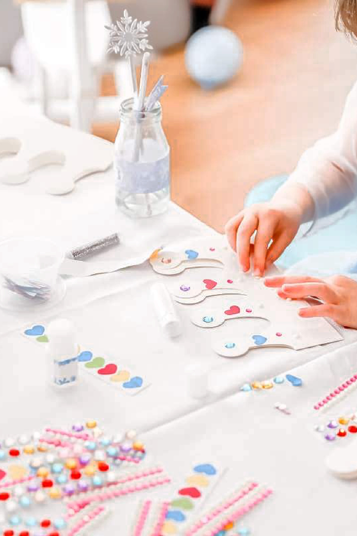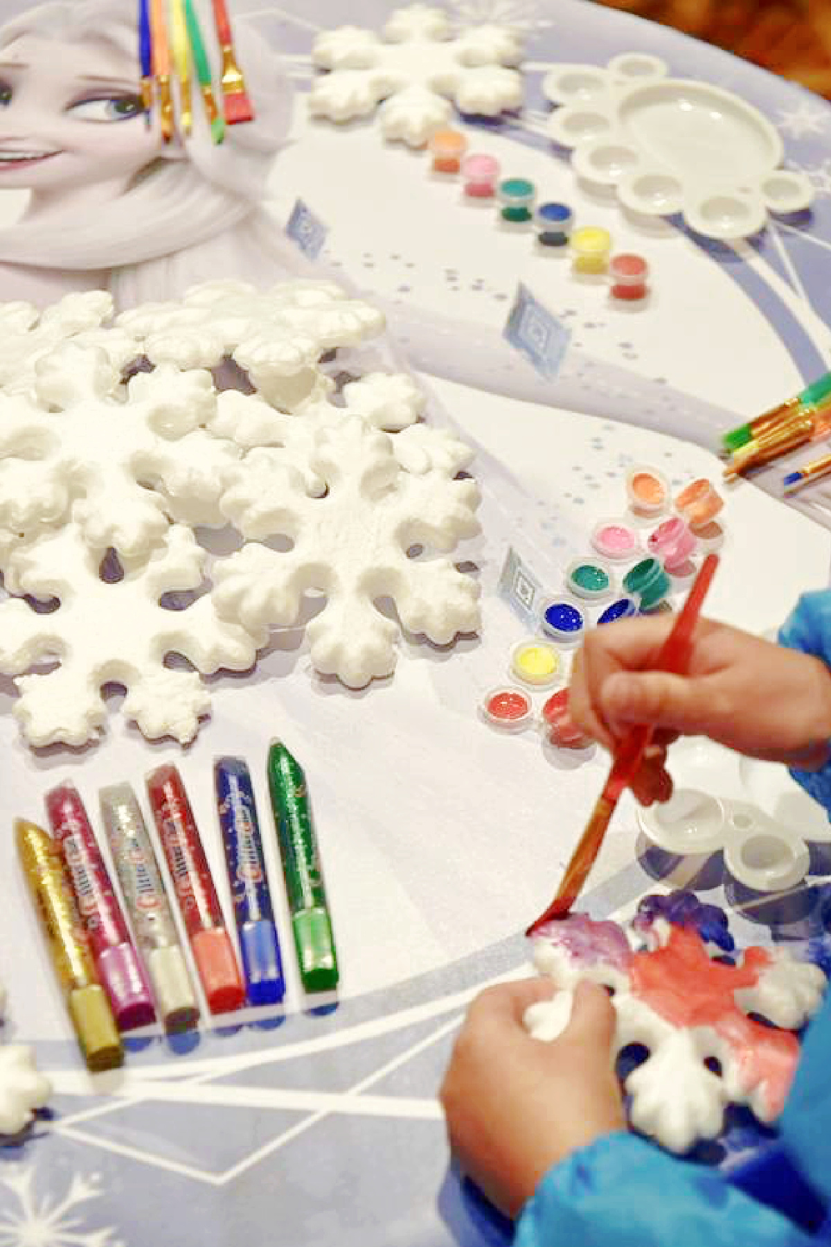После того как краска высохнет, у них будут красивые, изготовленные своими руками снежинки, которые они смогут забрать домой в качестве сувенира на память о празднике в стиле «Холодного сердца».