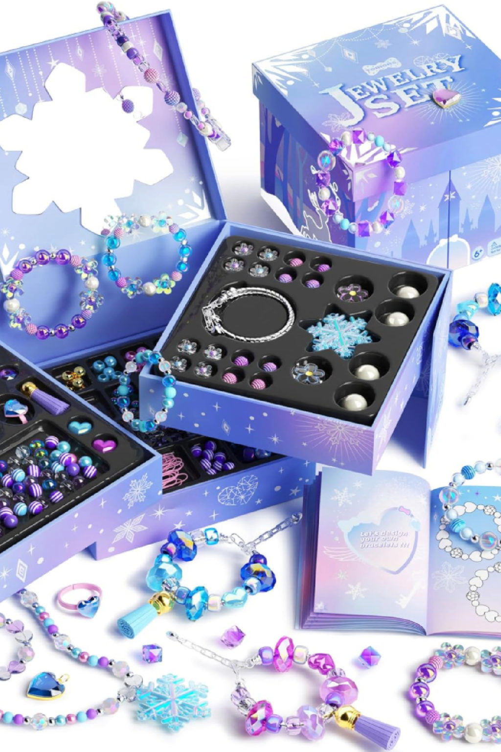 Можно поискать готовые наборы или самостоятельно подобрать бусины в гамме праздника. Обязательно поищите подвески в виде снежинок, чтобы браслеты и колье вышли тематическими.