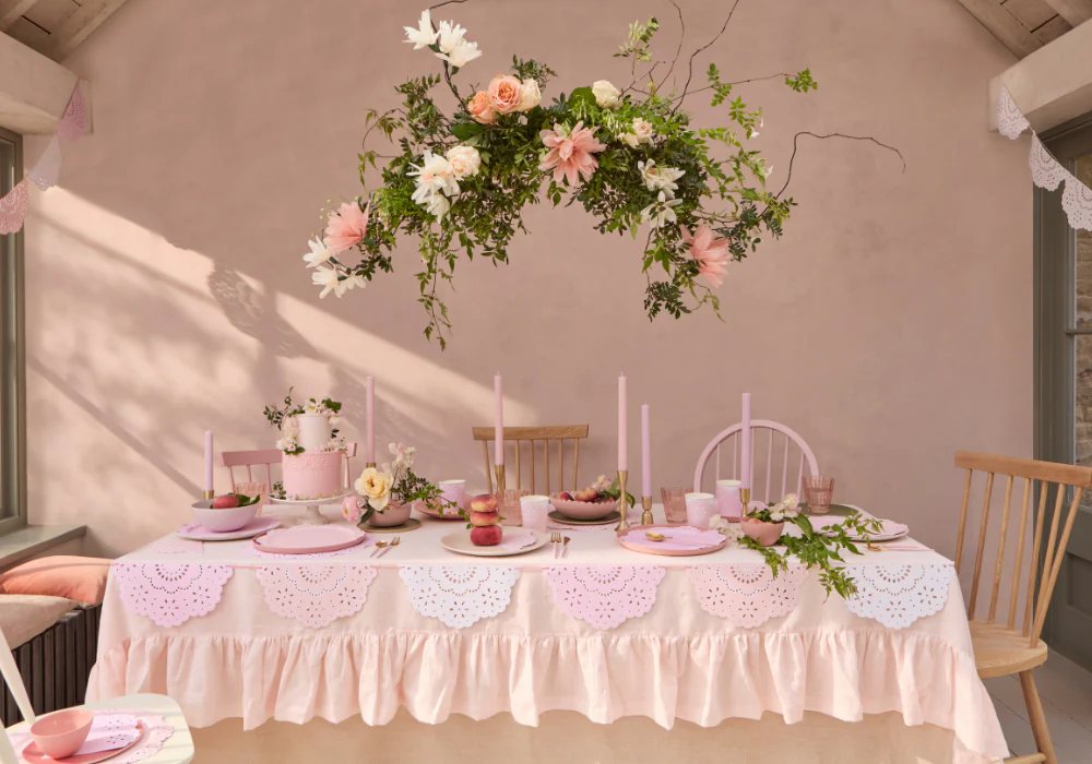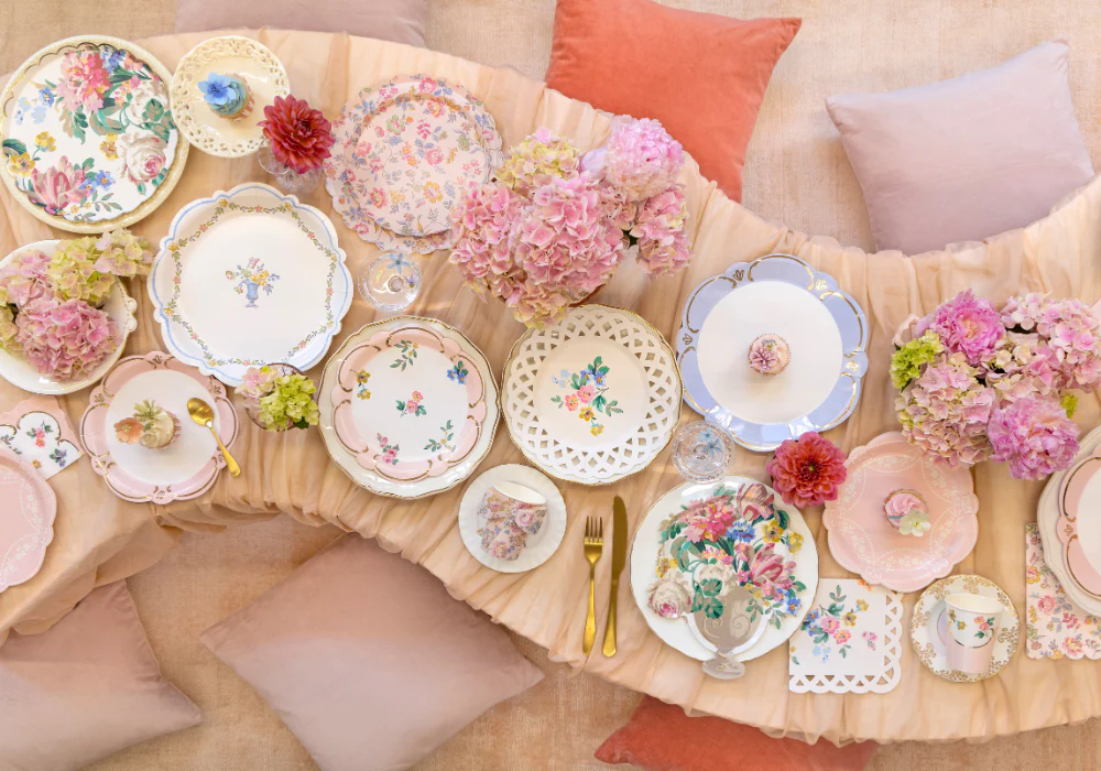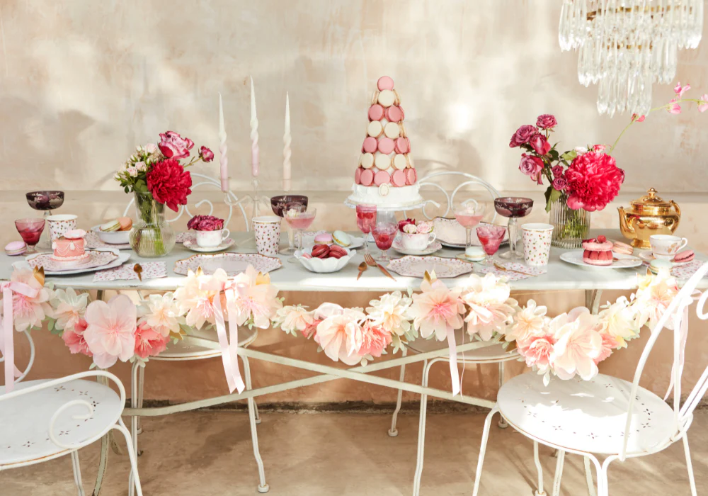 Красивое оформление выбранного места проведения — основа для создания триумфального девичника. Декор будет зависеть от темы: если это вечеринка в саду на закате среди огоньков гирлянд, то используйте бумажные вертушки Meri Meri и простую посуду, а если это чаепитие, украсьте помещение цветочными гирляндами, например, гирляндой из бумажных цветов Meri Meri. А посуду выбирайте с традиционными английскими принтами из цветочков.