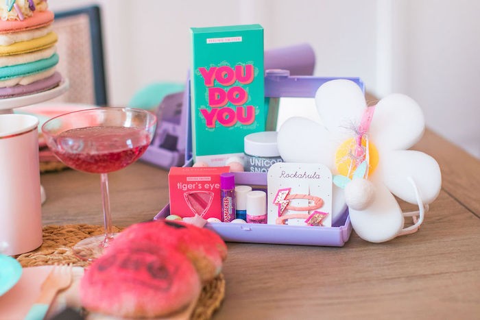 Весна, Пасха, свежие цветы — идеальные факторы для организации девчачьей вечеринки! Декораторы собрали в одном месте веселых девчонок и радужный декор, чтобы создать волшебный яркий праздник. Стол сервировали радужными и круглыми мятными тарелочками, которые идеально сочетались с плетеными салфеточками. А рядом с ними лежали бисквитные кролики — все разных цветов в гамме праздника. Каждая девочка получила в подарок сиреневый чемоданчик с аксессуарами и другими милыми памятными подарками. Они также дополнили сервировку стола. Особенно ярко украсили стенд со сладостями — сиренево-малиновая гирлянда из воздушных шаров с желтыми цветочками. Следуя тематике праздника, декораторы нашли стильную подставку в форме розового кролика, на которой разложили свежие ягоды, кусочки кулича, мармелад, маршмеллоу и печенье. А вот таких милых ребятишек сделала кондитер специально к празднику — такую красоту жаль даже есть! Хорошо, что они сохранятся на фото :) Тортик был сделан из миндальных коржей с кремовой прослойкой — получилось что-то вроде гигантского многослойного макаронс. На столе было множество симпатичных мелочей — от цветочных букетиков до красивых тематических угощений. А вот и подарочные чемоданчики вблизи — внутри была детская косметика, сладости и украшения для волос. Этот радужный праздник можно смело устраивать и для мальчиков, и для девочек — декор очень универсален. Смотрите наш каталог, чтобы найти похожую посуду для оформления! Источник: karaspartyideas.com