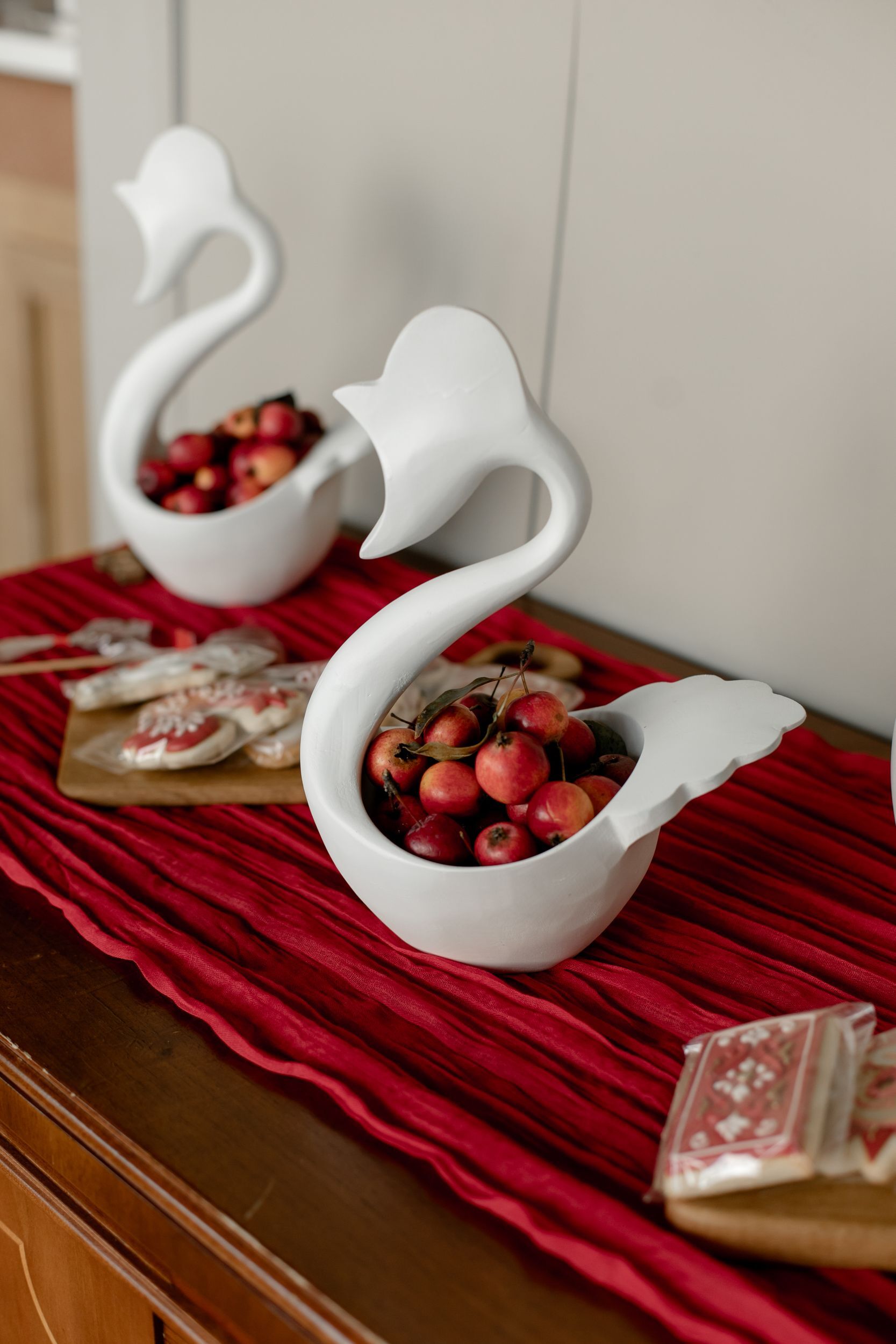 Этих изящных лебедей тоже предоставила клиентка, она купила их специально для праздника! Мы наполнили их яблочками-ранетками и разложили рядом чудесные пряники от нашего кондитера.
