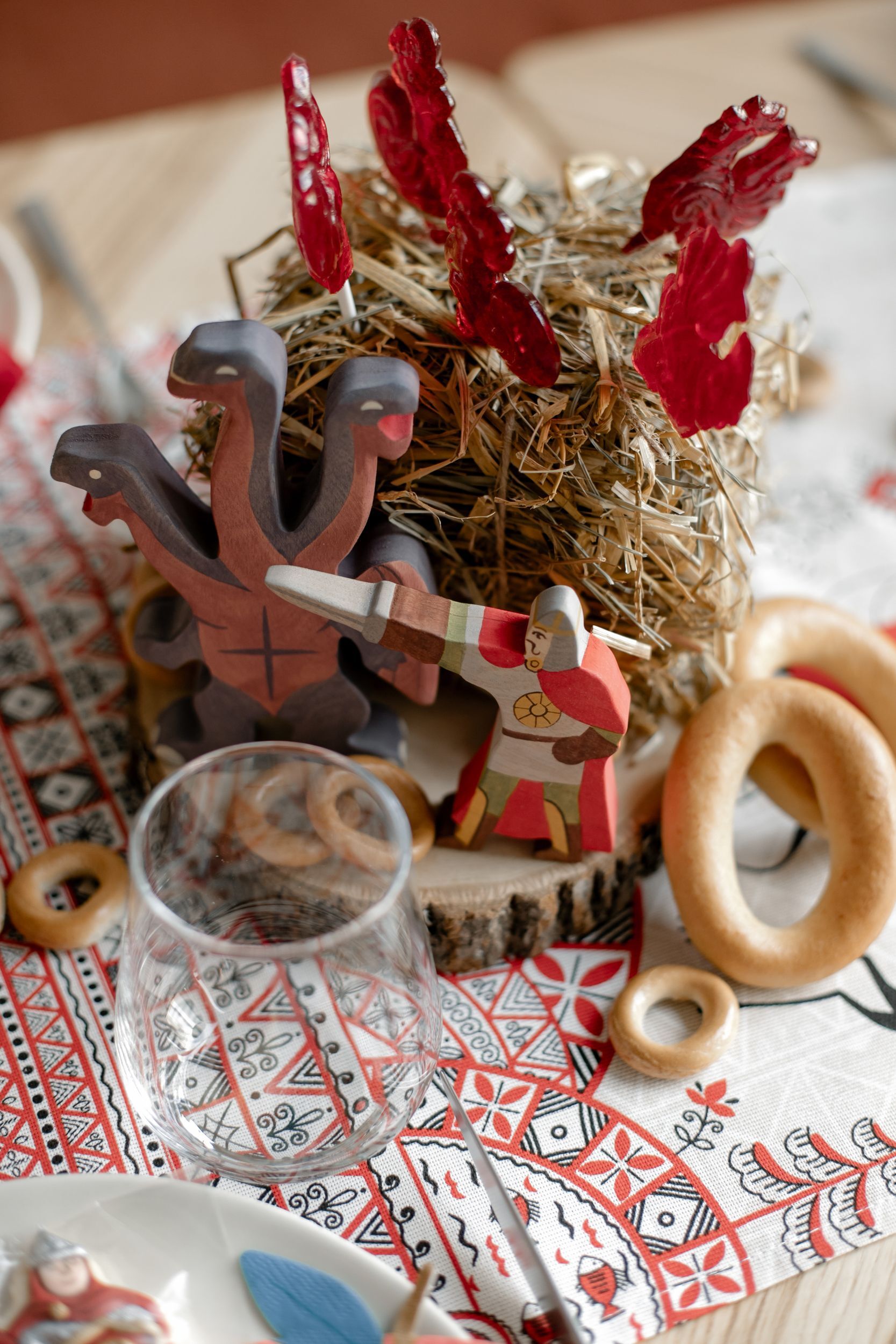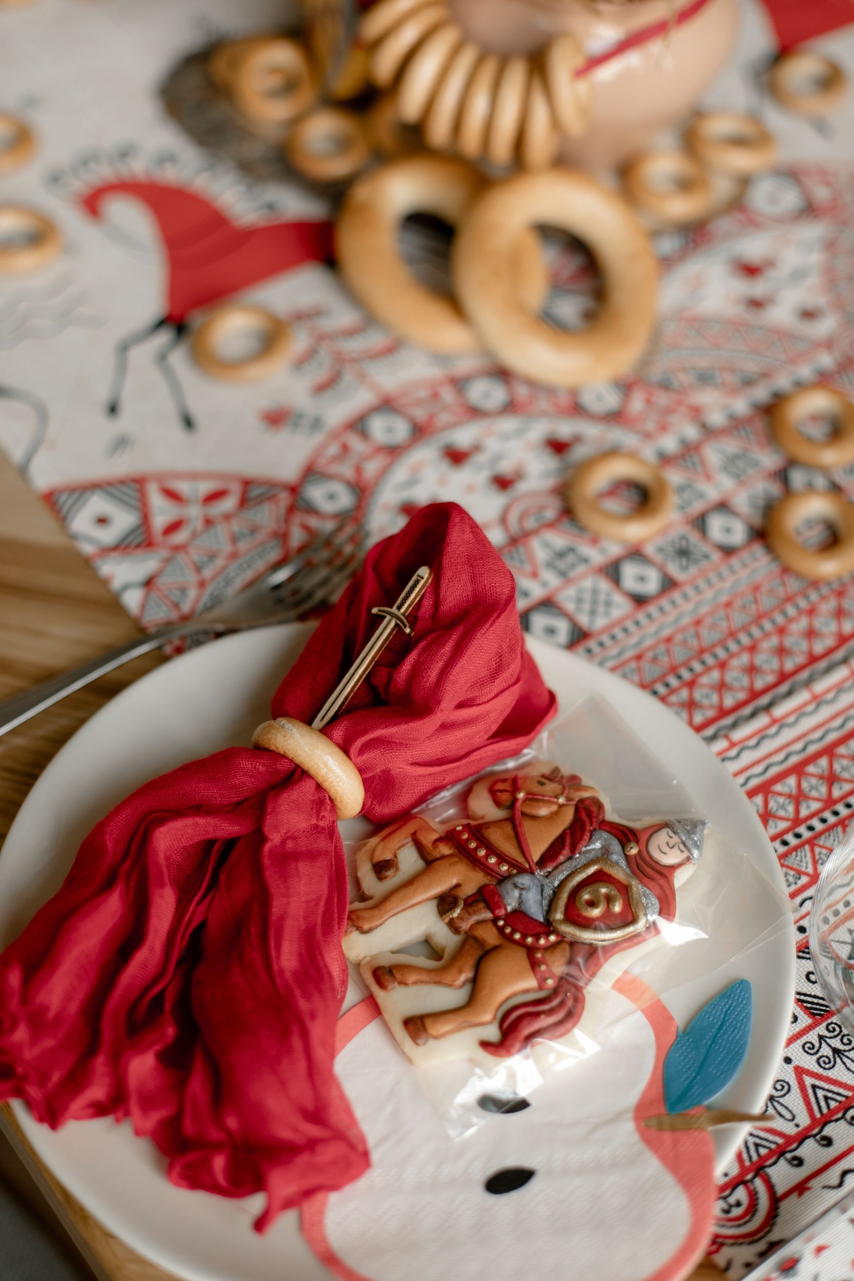 Детский стол мы украсили деревянными фигурками богатырей, изготовленными на заказ, и салфетками‑яблочками от Meri Meri; в процессе оформления пришла идея использовать баранки в качестве колец для салфеток, и это решение оказалось очень удачным! Гости удивились такой простой, но забавной идее.
