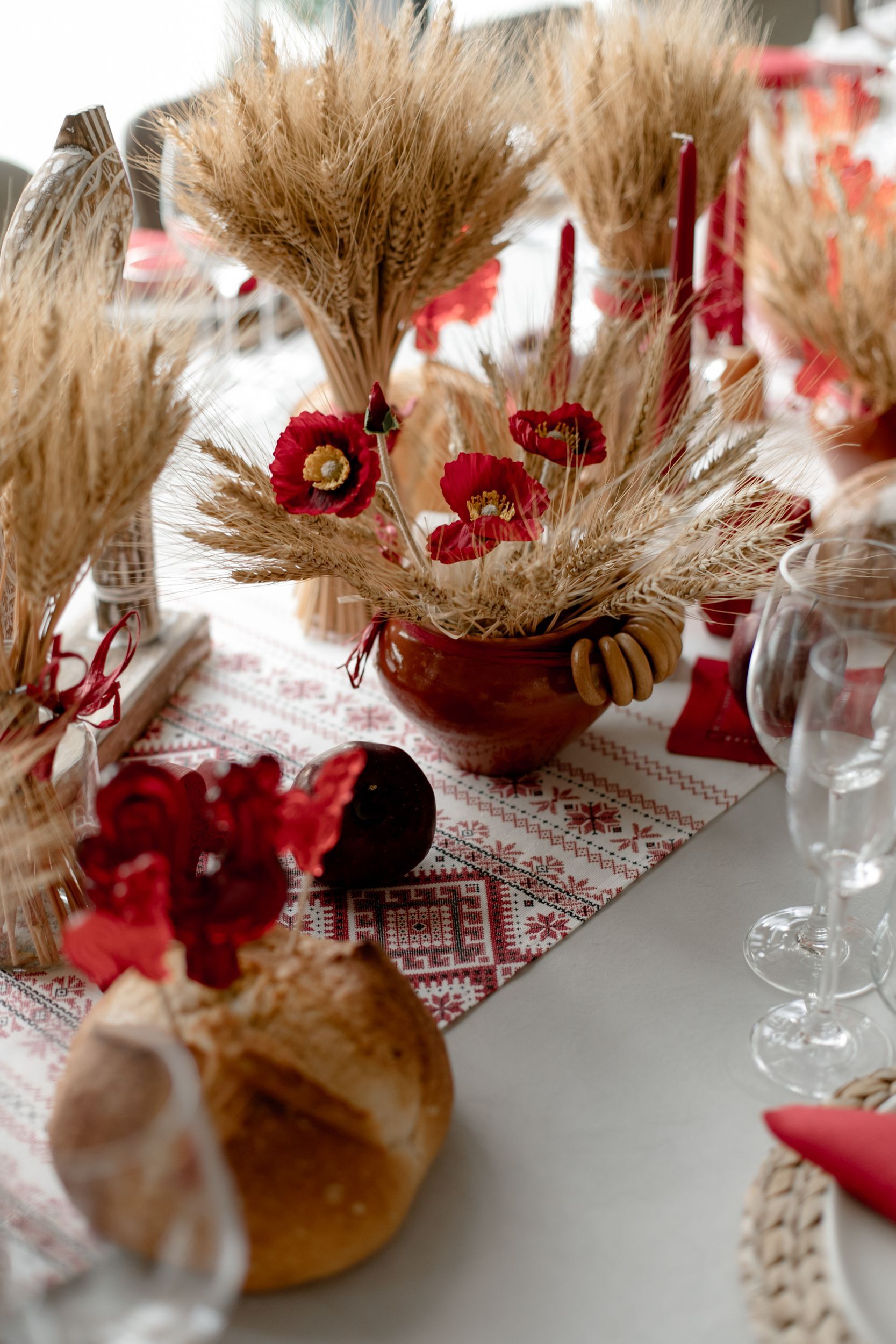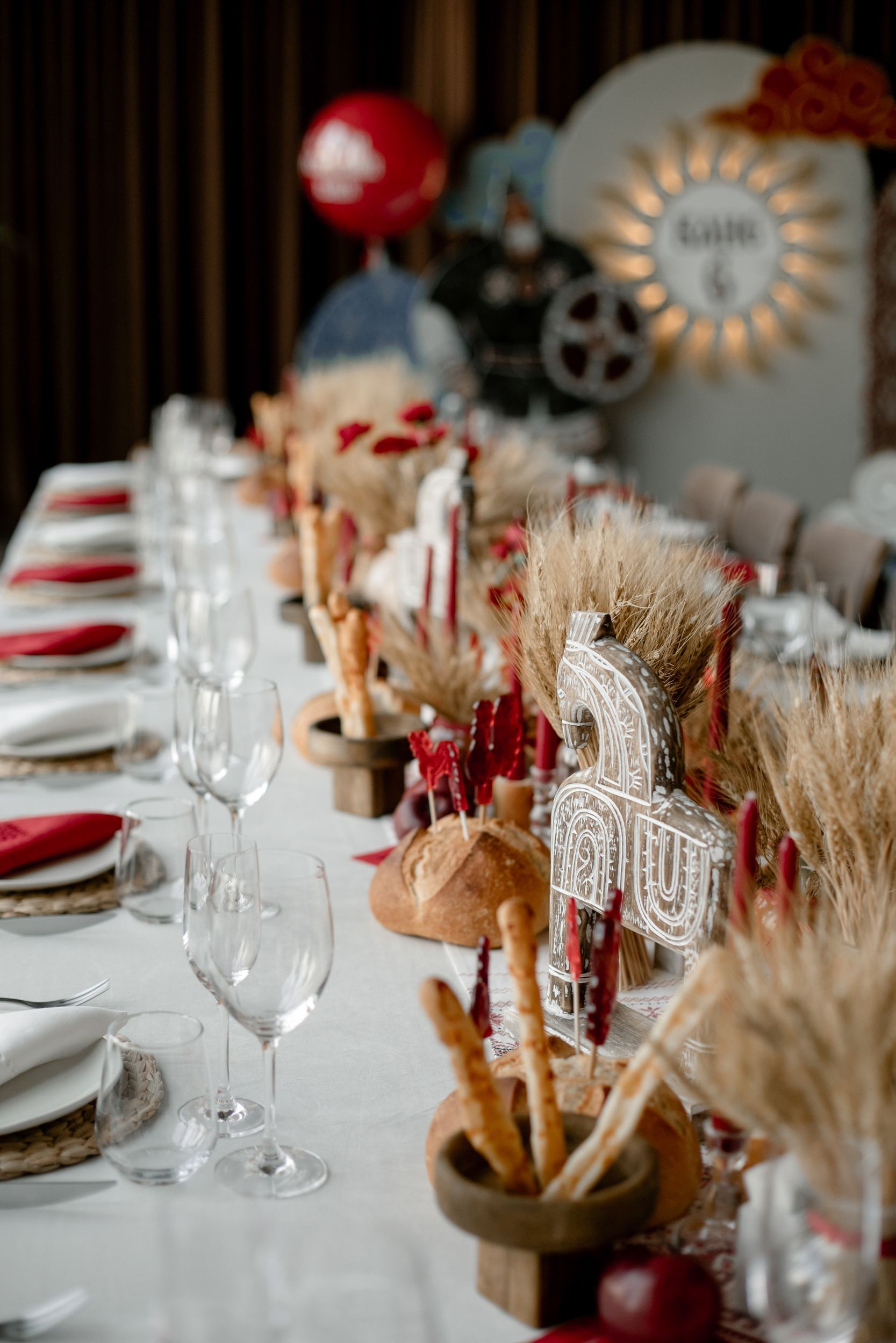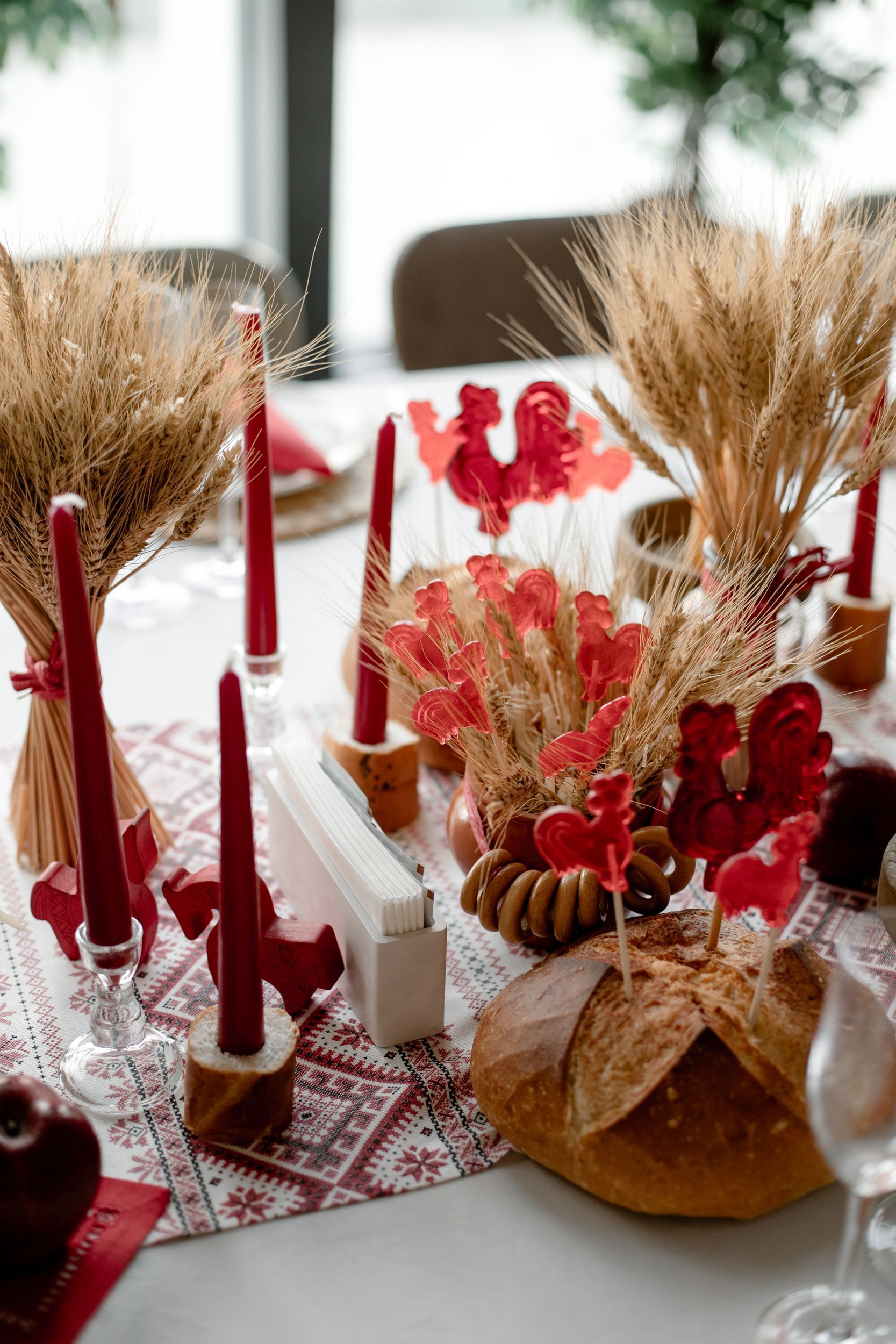 Мы сервировали два стола — детский и взрослый. Взрослый стол оформили более сдержанно, но с оригинальными деталями: например, использовали караваи в качестве подставок для леденцов‑петушков, а ещё составили красивые букеты из колосьев и маков.