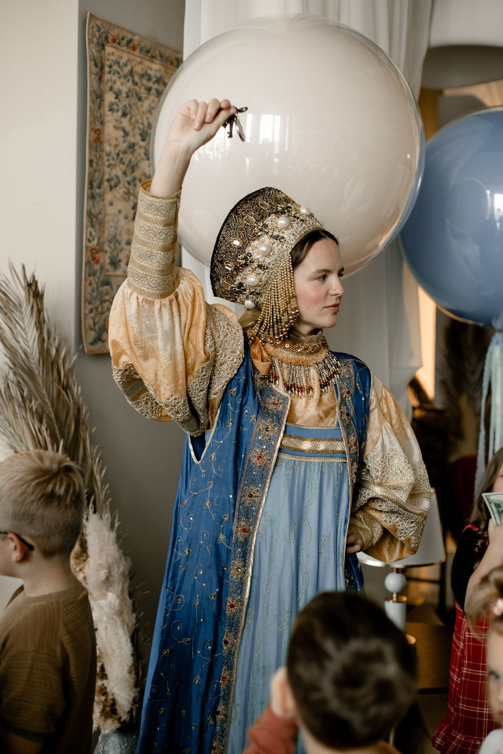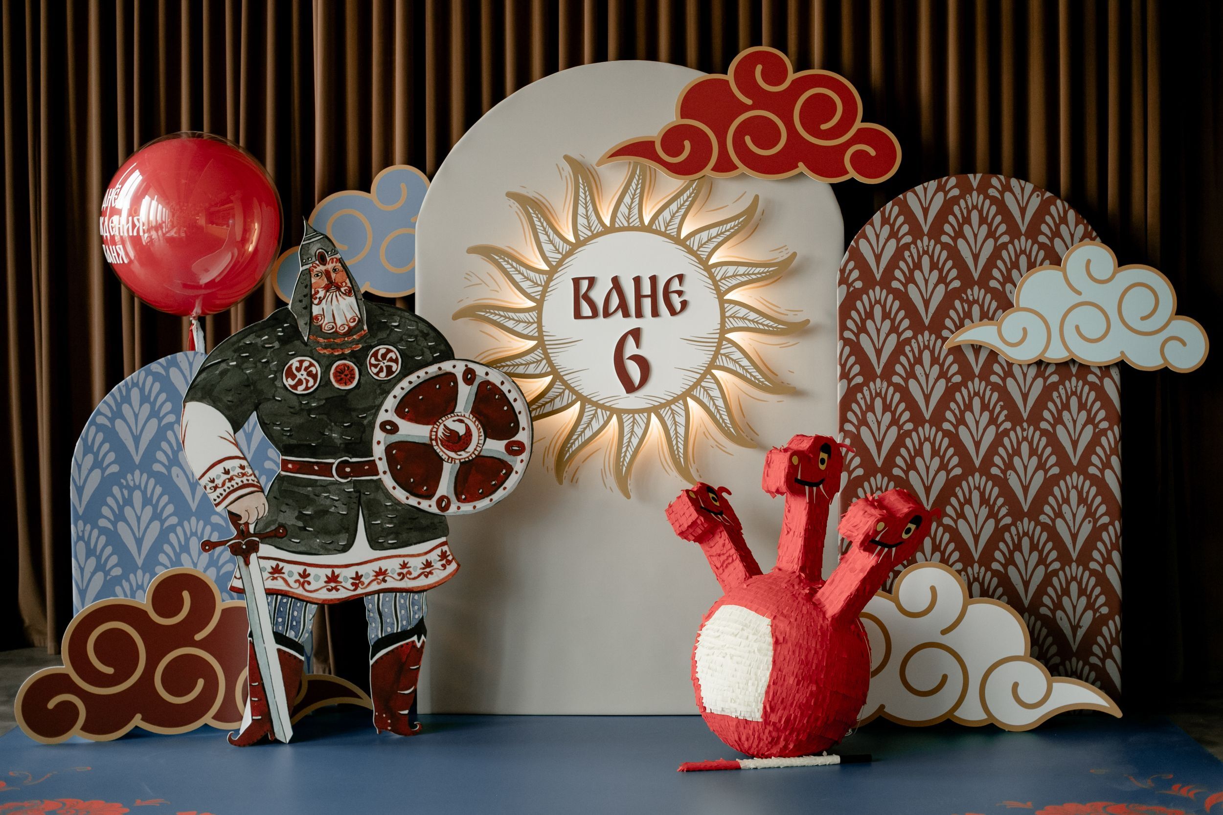 Мы целый месяц кропотливо продумывали праздник в стиле богатырей для именинника Вани, которому исполнилось пять лет. Всё началось с потрясающих исторических костюмов — мы взяли их в аренду, и особенно впечатлял костюм богатыря, весивший целых 12 килограммов.