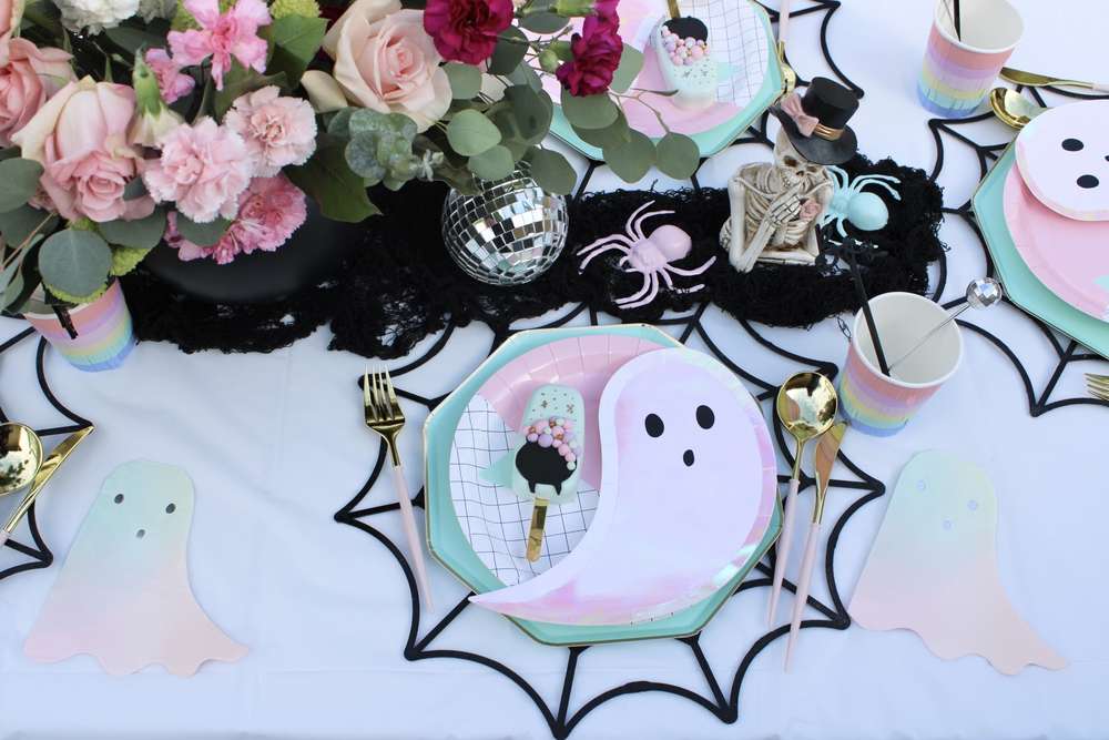 Нежный Хэллоуин в розовых тонах и с букетами живых цветов — это идеальный вариант, чтобы порадовать девочек! Для нас этот праздник не страшный, а стильный и милый. Стол украсила посуда от Meri Meri: невероятные тарелочки-привидения в сочетании с базовыми мятными, стаканчики с бахромой и милые салфеточки-призраки. Все угощения тоже были в пастельной гамме, чтобы сочетаться с декором праздника. Стол украсили салфетки-паутинки, которые положили под каждую тарелочку, а по центру стола протянули черную марлевую ткань. Посмотрите, какое волшебное сервирочное блюдо! Оно может стать прекрасным украшением стола. Источник: catchmyparty.com