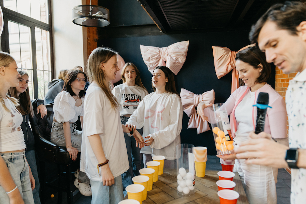 Небольшая часть нашей команды — я, Саша и Егор на вечеринки для Иланы, которую мы создали в трендовой теме с бантиками. Илана уже подросток, поэтому мы тщательно подбирали и декор, и развлекательную программу, чтобы праздник балансировал между детским и взрослым. А вот и наша именинница, которая даже решила одеться, согласно тематике. Входную зону мы тоже украсили множеством маленьких бантиков, которые свисали с потолка и создавали необычный эффект. Даже шарик украсили в стиле праздника! А стену в зале, где проходил праздник, мы украсили текстильными бантиками — такой приём мы уже использовали в одном из наших праздников. Для развлекательной программы мы выбрали челленджи — это отличное развлечение для детей постарше, и интересно, как мальчикам, так и девочкам. Мы проводим челленджи для детей лет от 10 и старше, они одинаково хорошо заходят в любом возрасте, да и взрослые часто рады поучаствовать. Мы придумали много интересных конкурсов, а наши очаровательные ведущие не давали никому заскучать. А вот и наше сладкое произведение искусства — изысканный тортик в стиле Марии-Антуанетты! Он прекрасно вписался в тематику праздника