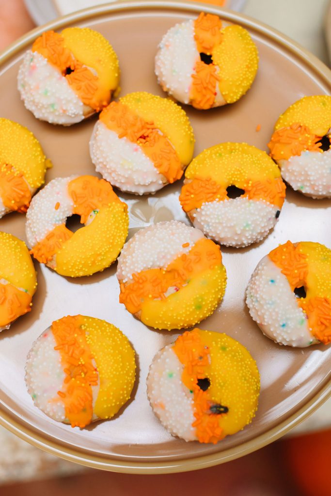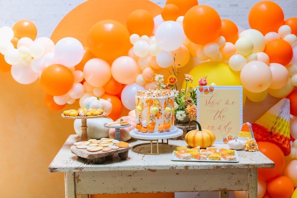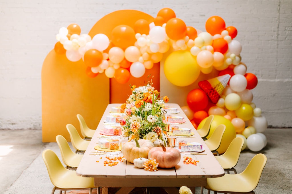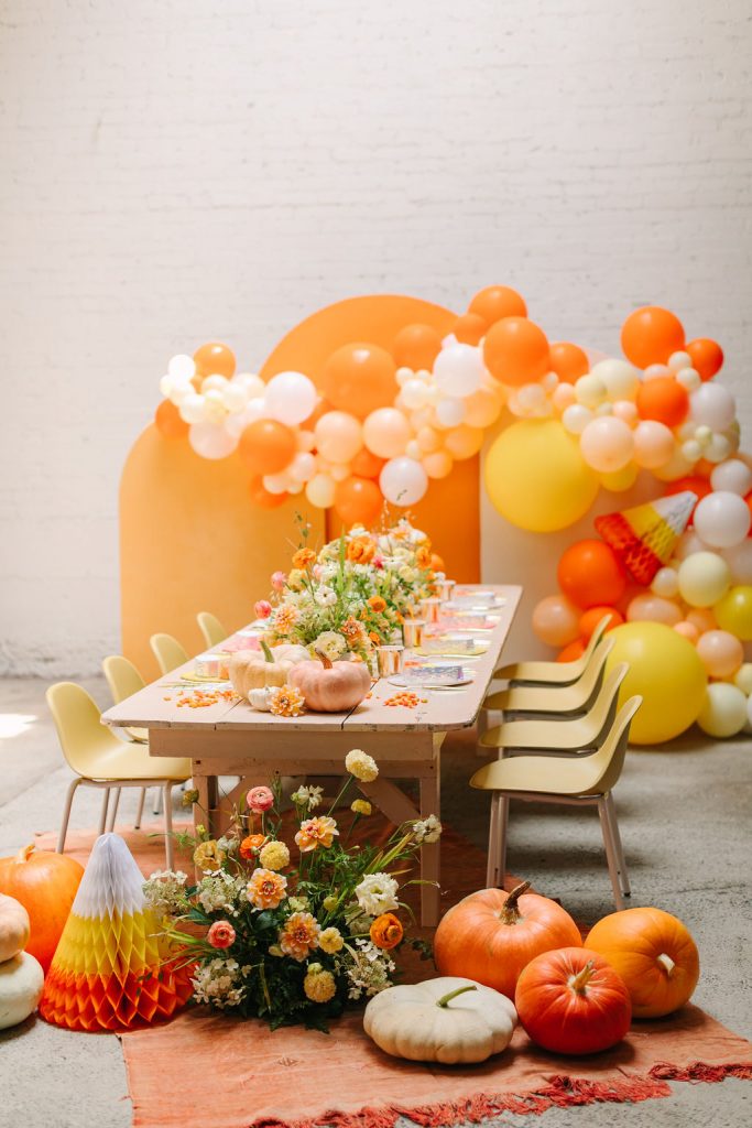 Кукурузные конфеты — популярное угощение в США на Хэллоуин! Посмотрите, какой яркий праздник создали декораторы, использовав их, как главный мотив. На фоне стола создали сочную оранжевую композицию — картонные арки и пышная гирлянда из воздушных шаров. Стол украсили базовые белые тарелочки, золотые столовые приборы. А еще для каждого Источник: beijosevents.com
