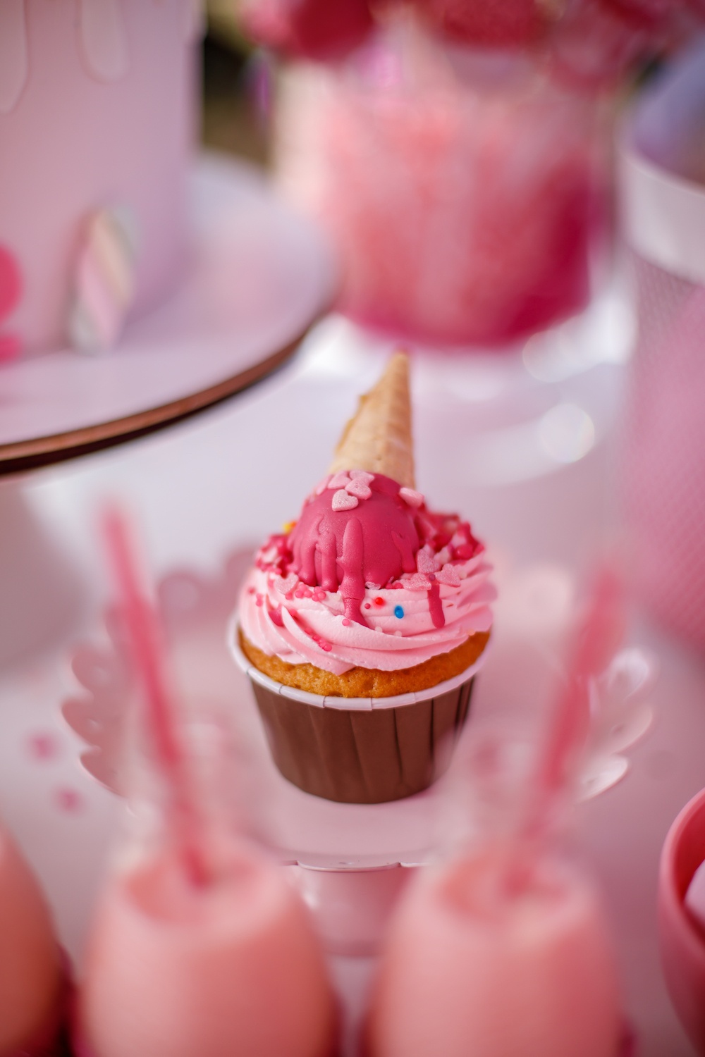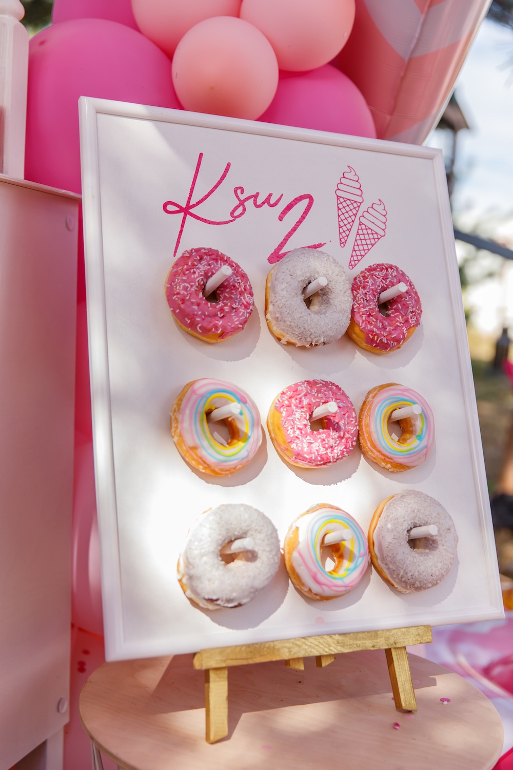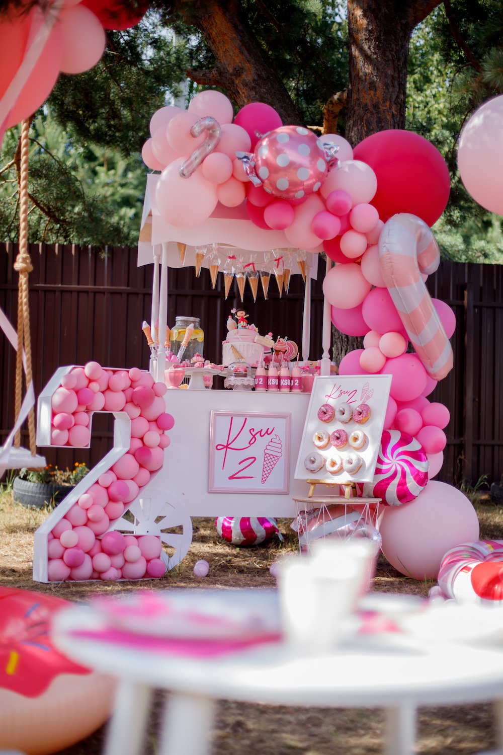 Если вы любите розовый цвет, то сейчас вы упадете в обморок от восторга! Представляем вам самую розовую вечеринку, которую мы оформили для двухлетия именинницы Ксю! Так как день рождения проходил летом, мы сделали оформление на улице, под открытым небом! В одном углу мы разместили тележку для угощений, на которой расставили торт, напитки и сладкие закуски. Мы очень любим такую подачку пончиков — от нее в восторге не только дети, но и взрослые! Для напитков мы создали тематические этикетки с надписями — специально под этот праздник! Даже бутылочки с водой стали тематическими :) Посмотрите, какой здоровский торт! Его украсили сладости из мастики и фигурка именинницы на самой верхушке. Капкейки мы украсили декором-мороженым — ни один элемент не остался без тематического оформления! Тарелочки взяли серии Toot Sweet, они идеально вписались в наш декор! Пространство украсили стримерсы, воздушные шары и классные надувные пончики!