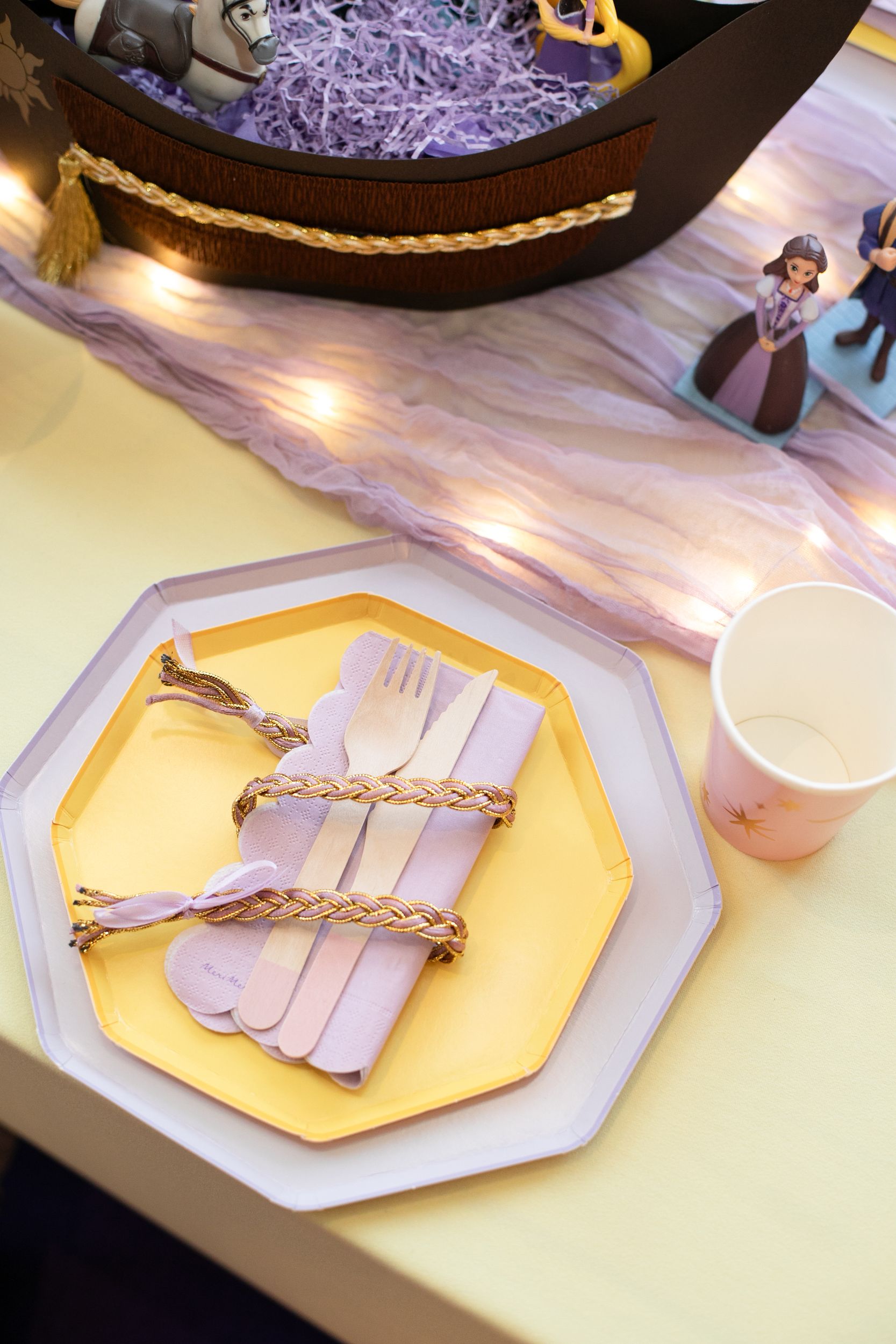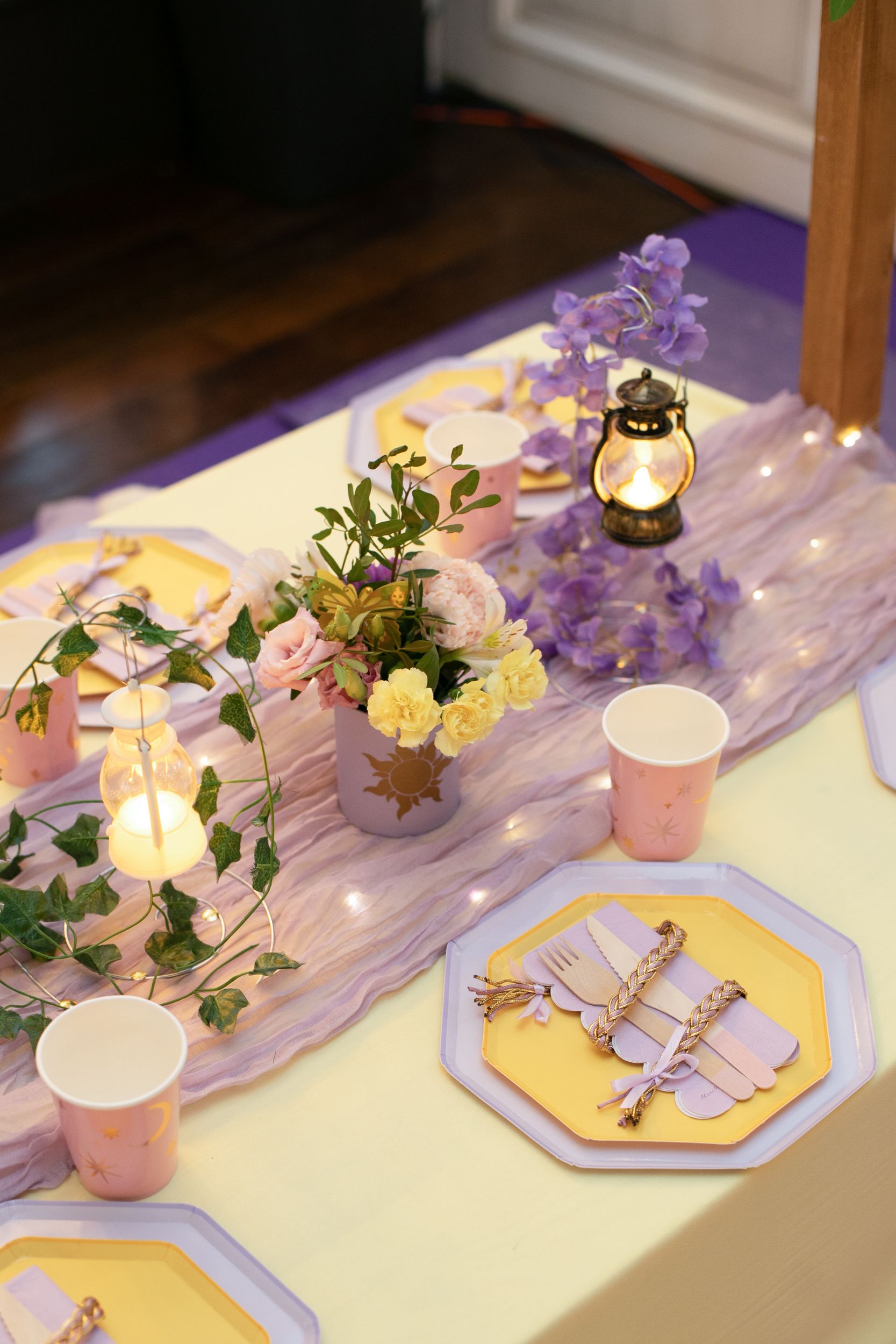 Множество деталей украсили обеденный стол детишек, а в сервировке нам помогла базовая посуда Meri Meri в сиреневых и жёлтых тонах.