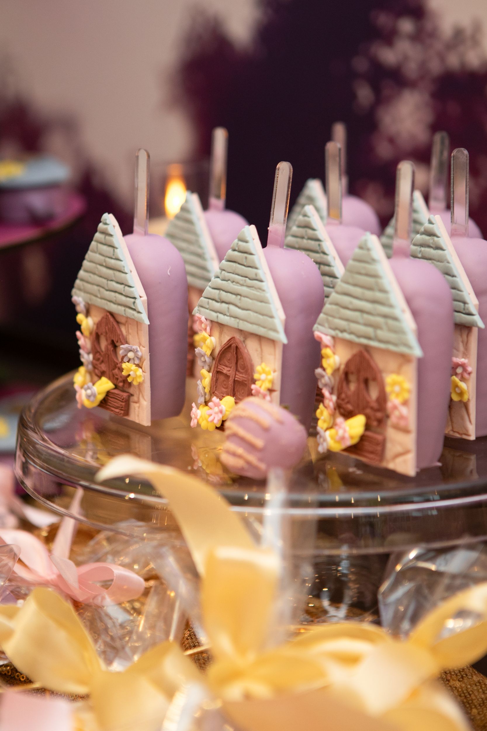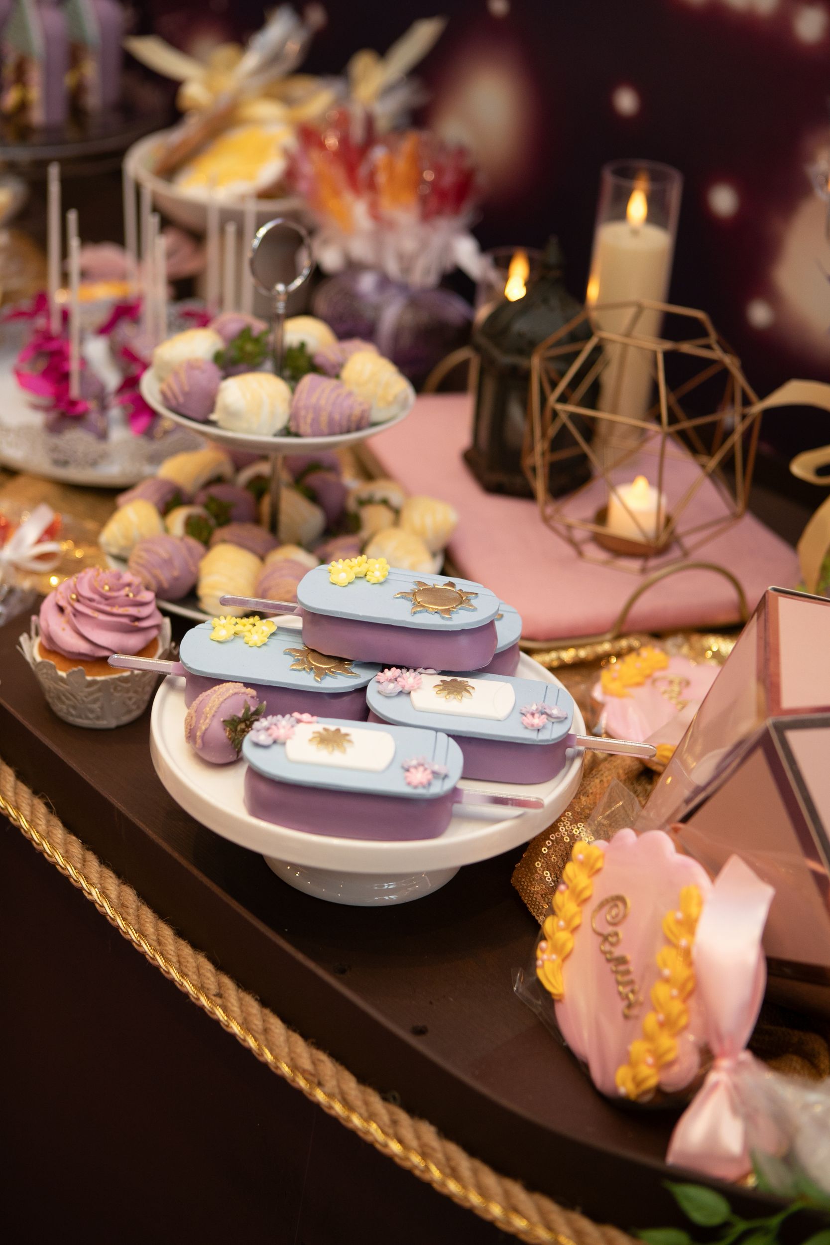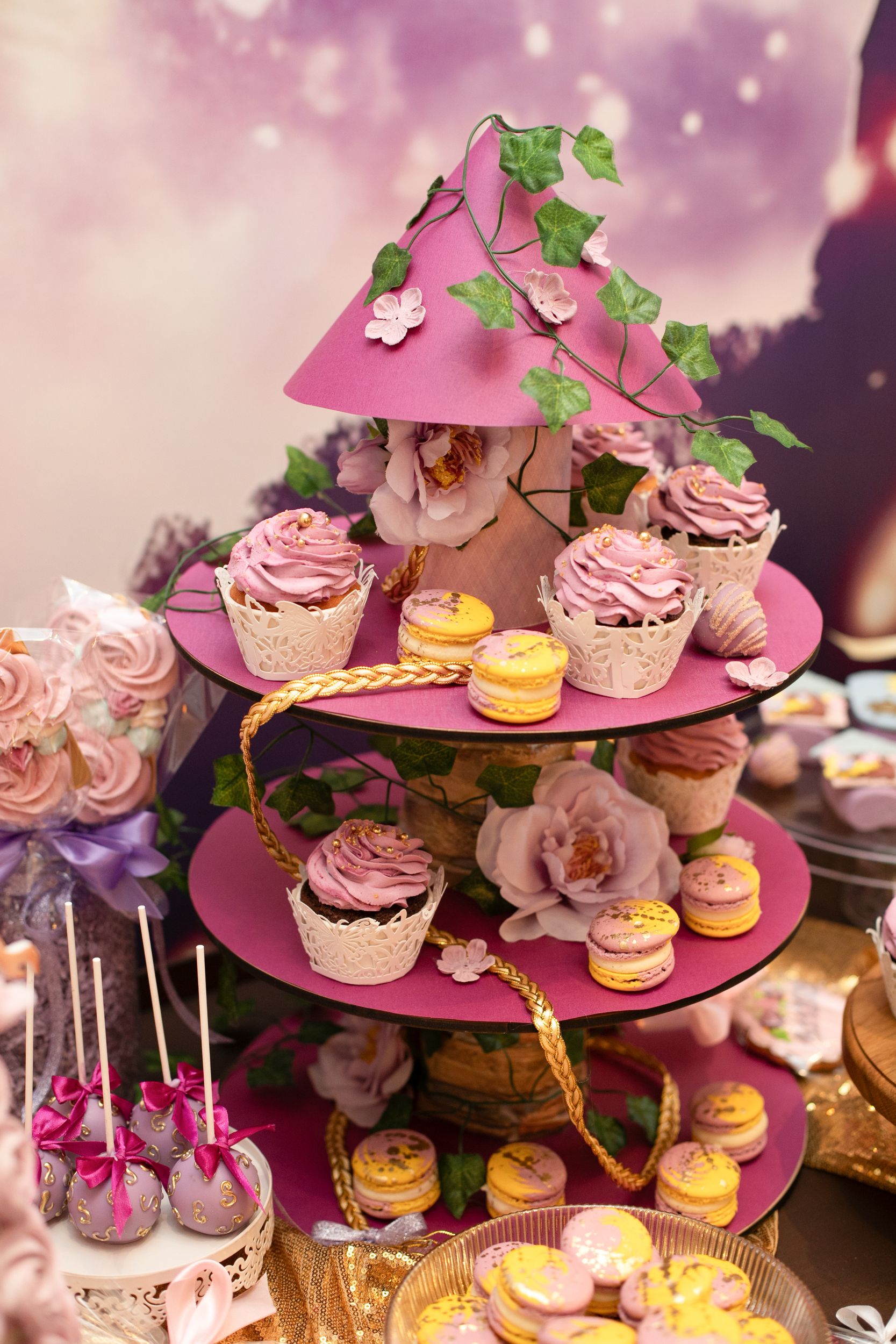 На столе гостей ждали: башня из безе, облака‑безе, капкейки и кейкпопсы с шоколадной и ванильной начинками, эскимо в форме башен, клубника, макаруны с позолотой, леденцы‑бабочки и тематические пряники — с именем «Селин» и цифрой 7, с датой праздника, в форме башни, солнца и короны.