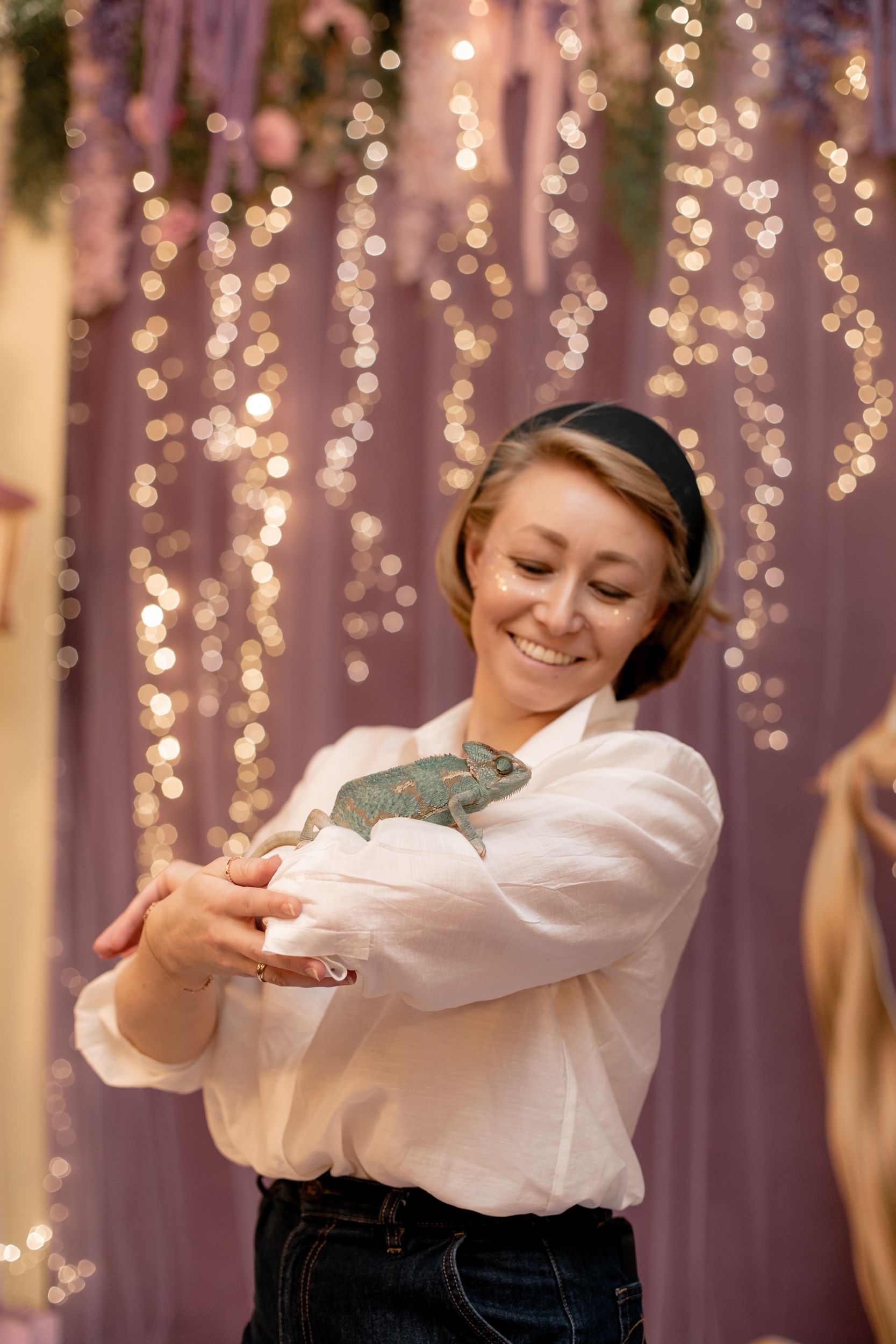 В оформлении мы сделали ставку на атмосферные детали. Пол украшали миниатюрные следы хамелеона, которые вели гостей прямо в главный зал — словно по следам сказочного персонажа. В воздухе на разной высоте парили десять гигантских шаров, декорированных лианами и цветами: они создавали эффект зачарованной рощи. Центром фотозоны стали изящная фигурка Рапунцель и оригинальные шары с цветочными композициями. А вместо привычных цветочных букетов на столах разместились тематические аранжировки в единой стилистике — вместе с особой посудой они усиливали сказочное настроение.