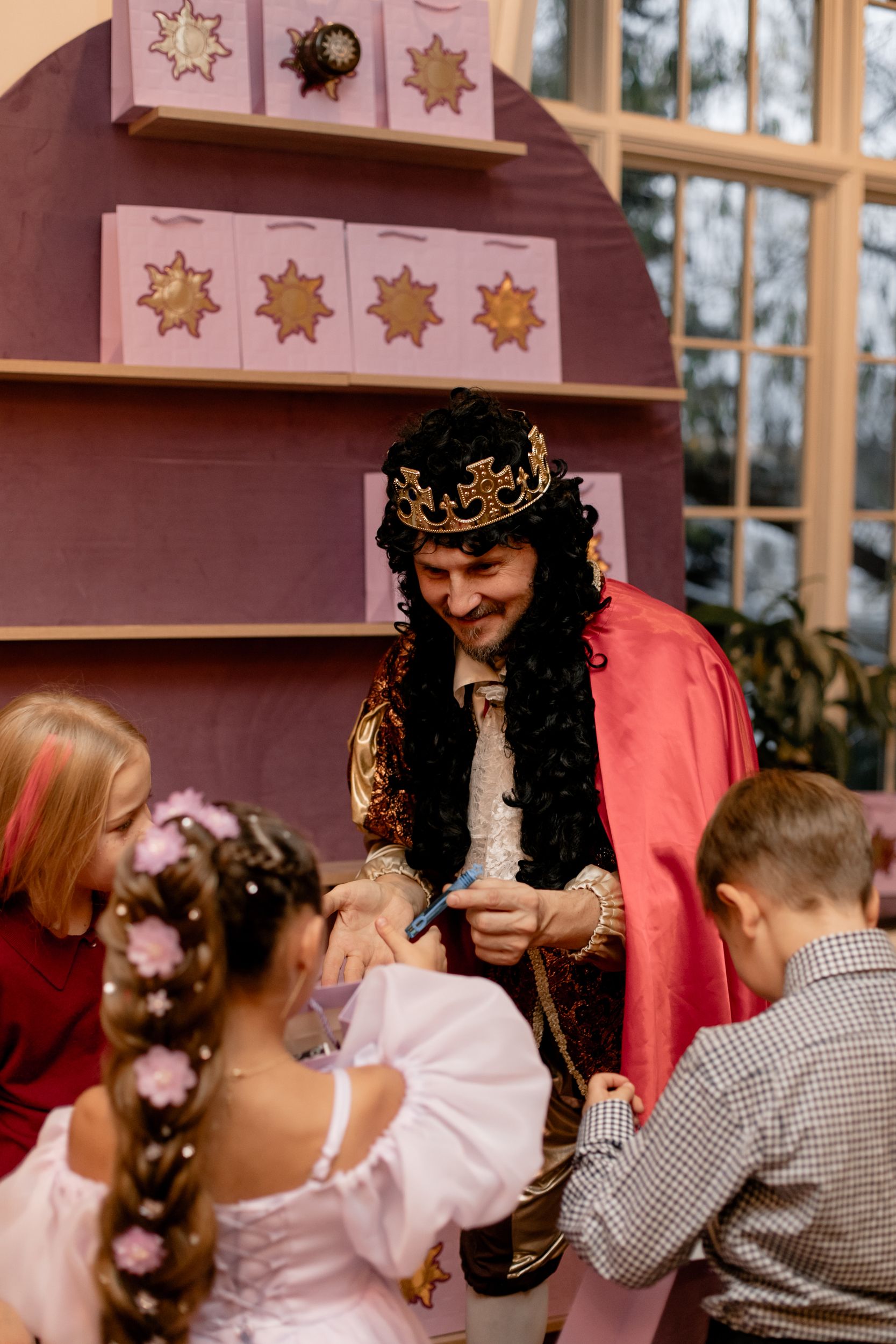 Юных гостей ждали и другие испытания: обучение королевским манерам, «приручение дракона», поиск Паскаля, мемори‑пазлы и игра «Волшебная лазейка». На творческих мастер‑классах дети создавали королевские причёски в палитре праздника, мастерили сияющие фонарики и рисовали панно с любимым хамелеоном. Завершили праздник удивительное шоу с животными и зажигательная бумажная дискотека — все ушли с улыбками и частичкой волшебства в сердце. А финальным сюрпризом стала яркая пиньята в форме солнышка!