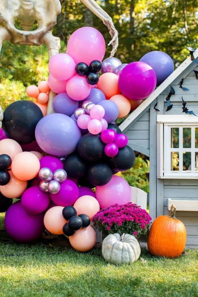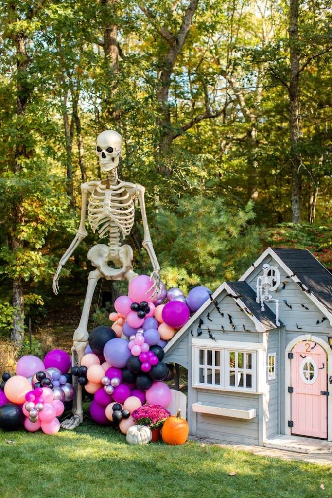 Кстати, рядом была ещё одна фотозона с маленьким игровым домиком, который украсили летучими мышами и поставили рядом двухметрового скелета! Он казался настоящим гигантом на фоне этого крошечного домика. Согласитесь, когда в гирлянде используют шары разного размера, получается очень эффектно!