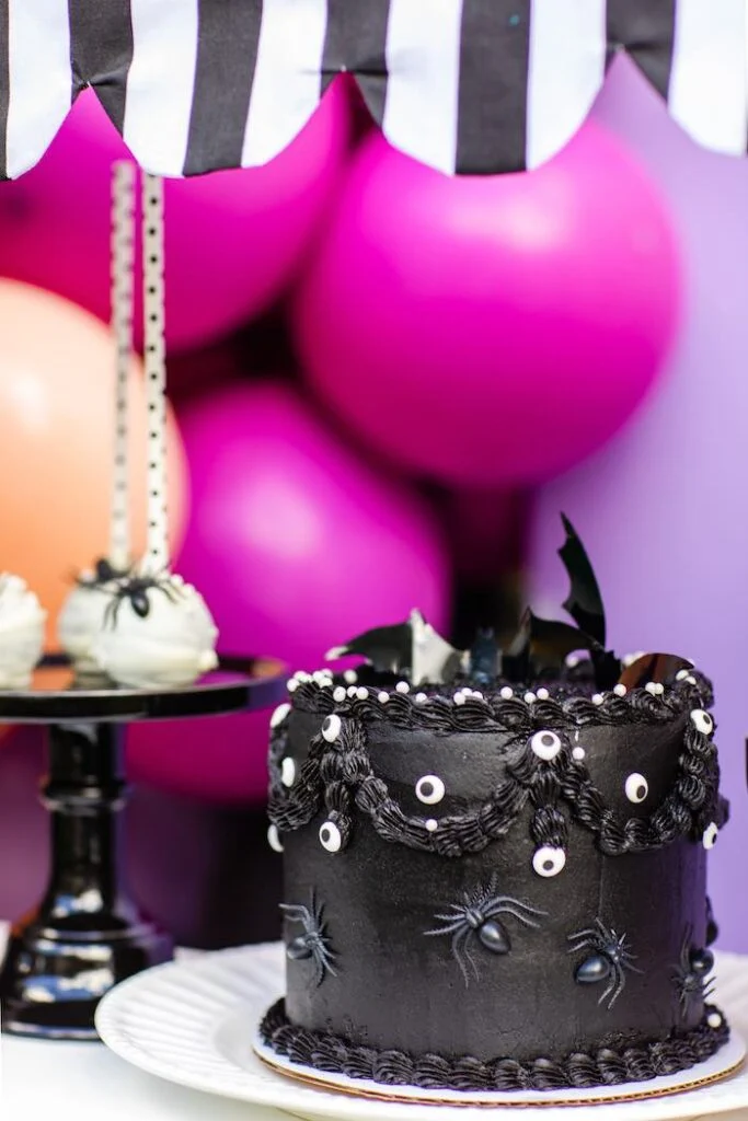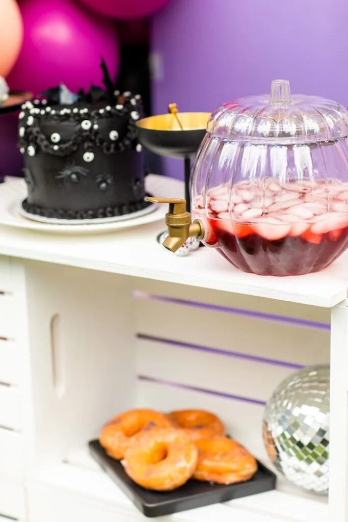 Если за гламур отвечали яркие гирлянды из воздушных шаров и диско-шары, то за страшную составляющую были скелеты и зловещая еда! Например, этот чёрный-чёрный торт с пауками и кровавый напиток.