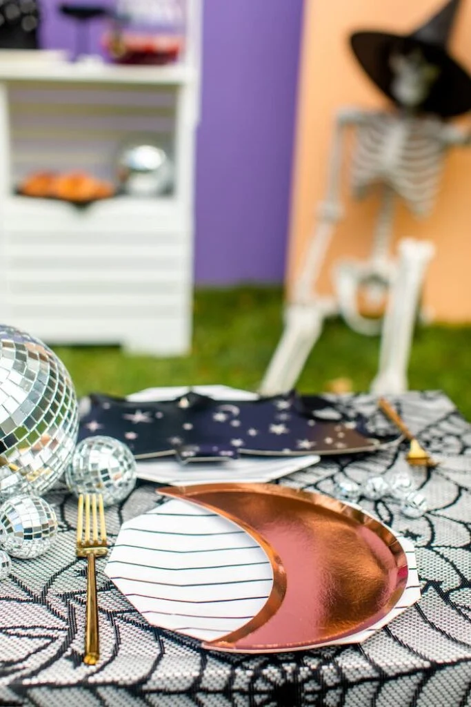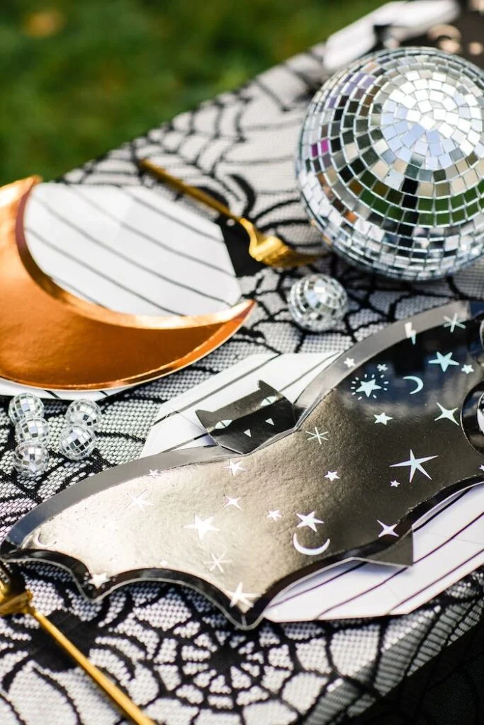 А на столе, украшенном чёрной паутинкой расставили тарелочки от Мери Мери! Это были очаровательные летучие мыши, полумесяцы и базовые тарелочки с голографической полоской.