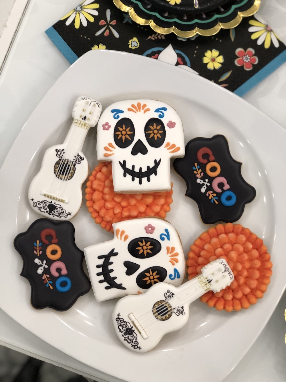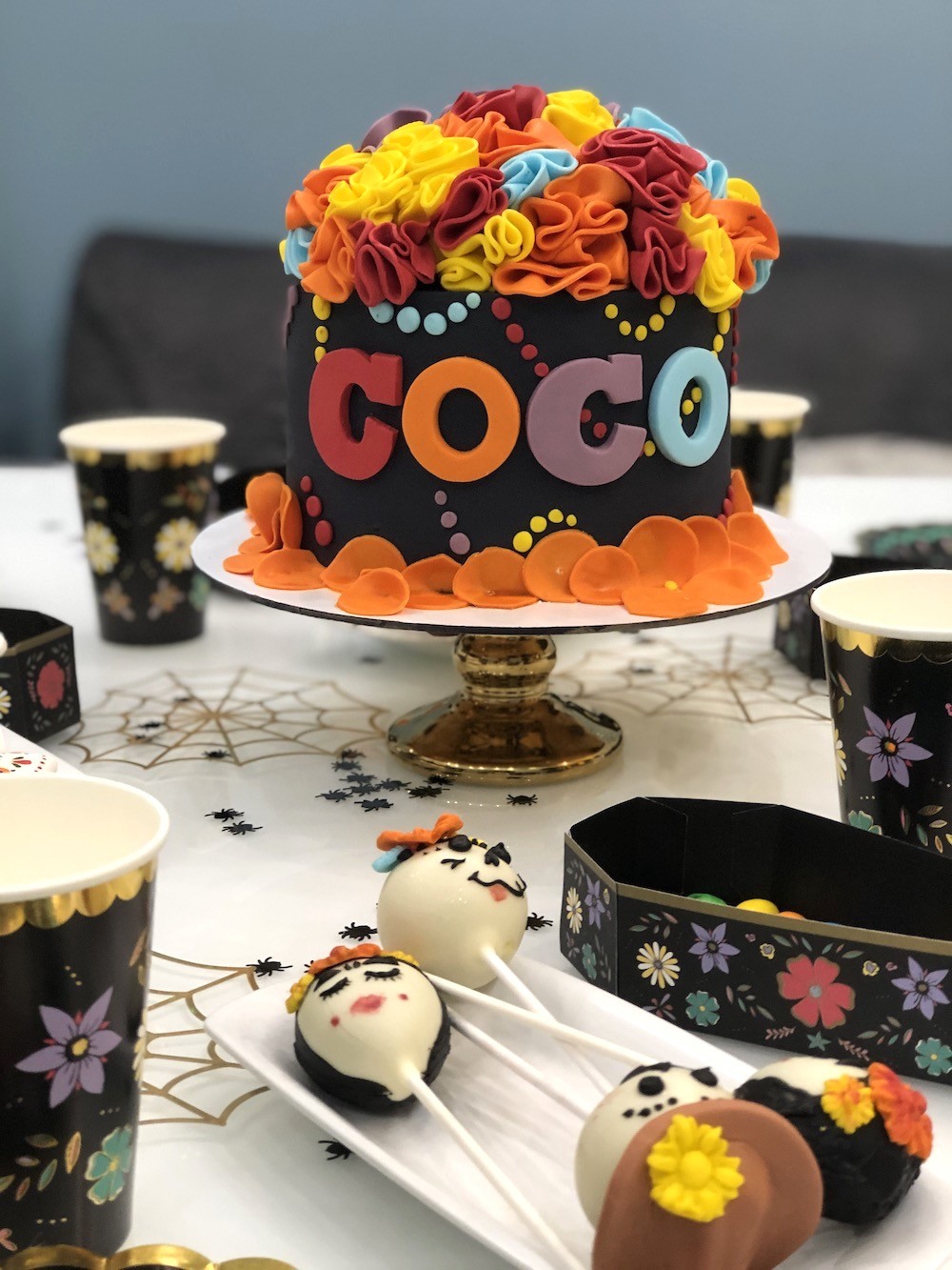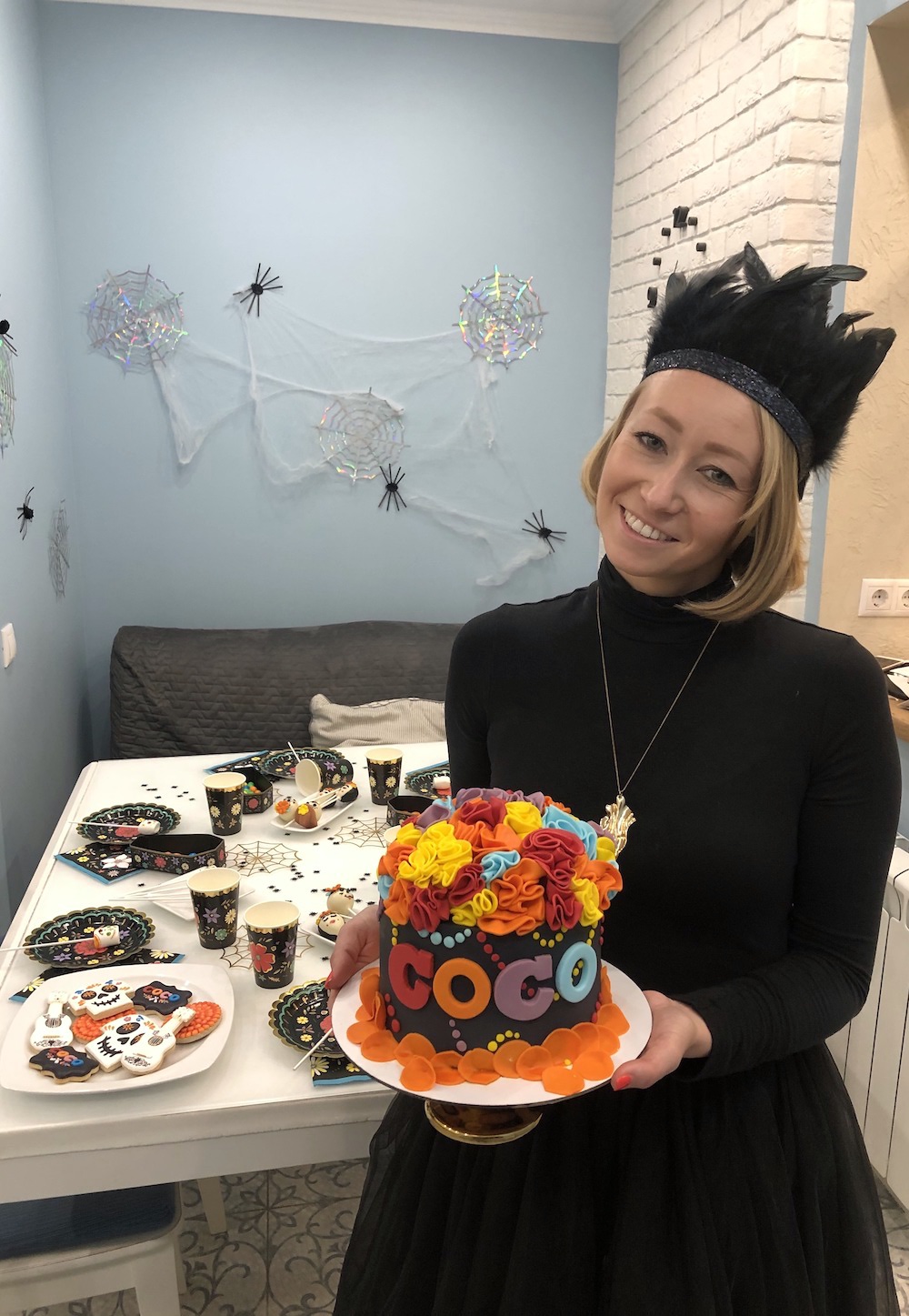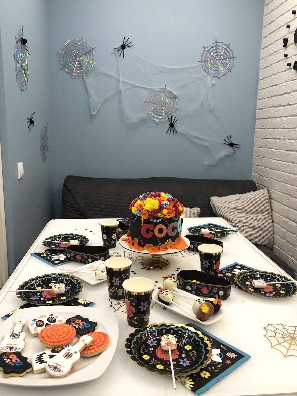 Яркий Хэллоуин сделать легко — вам понадобится наша мексиканская коллекция День мертвых, которая перенесет вас в сказочную атмосферу мультфильма Тайна Коко! А что еще классно, она подойдет и для детского праздника, и для взрослого. Как раз в нашем случае это был день рождения моей подруги, и мы устроили небольшое домашнее торжество вместе с детьми. Посмотрите, как с помощью стильного декора можно легко преобразить кухню! Мы накралыи на стол, расставив яркую мексиканскую посуду, добавили золотые паутинки и конфетти в виде пауков. А стену декорировали пераламутровыми бумажными паутинами, большими пауками и легкой паутинкой, которая выглядит, как настоящая! В стиле коллекции приготовили классное печенье с символами мультика: гитара, черепки, печенюшки с надписью Коко. Еще стол украшали милые кейк-попсы и шикарный торт с цветами из крема. Посмотрите, каждая печенюшка целое произведение искусства! Когда кондитеры делают такую красоту, угощения становятся украшением стола и ваших фотографий :) Над костюмами мы тоже подумали — как для детей, так и для себя. Внизу мы оставим ссылки на эту крутую корону с перьями и маски. В коллекции есть еще классные гробики, в которые можно положить небольшие закуски: конфетки, M&M's, попкорн, мармелад. Мы положили драже, потому что оно отлично подходило по цвету к оформлению!