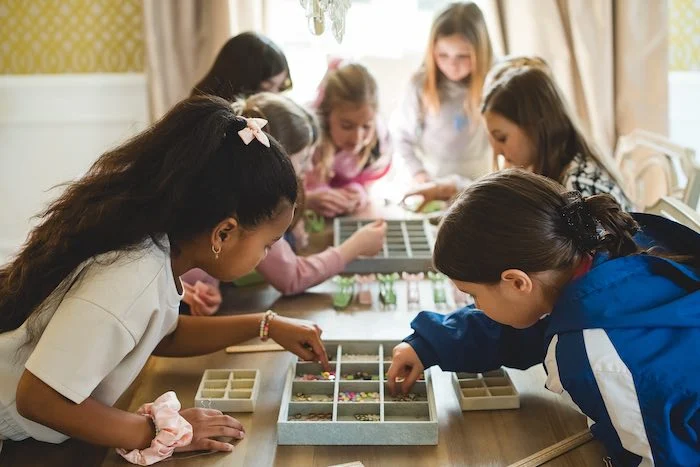 Мастер-класс стал долгожданным моментом праздника, ведь так приятно после дня рождения забрать с собой что-то памятное! Подарки для гостей это тоже важно. Девочки с удовольствием создавали собственные украшения: яркие бусы, изящные браслеты и украшали заколки-крабики для волос. Творческий процесс не только развлекал юных гостий, но и позволял каждой создать свой уникальный аксессуар.