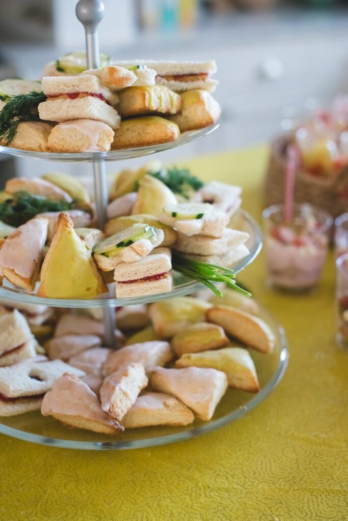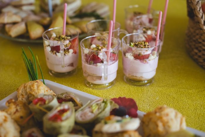 Закуски были простыми, но в них встречались розовый и зелёные цвета! Например, десерты стаканчиках были розовыми, а роллы зелёными.
