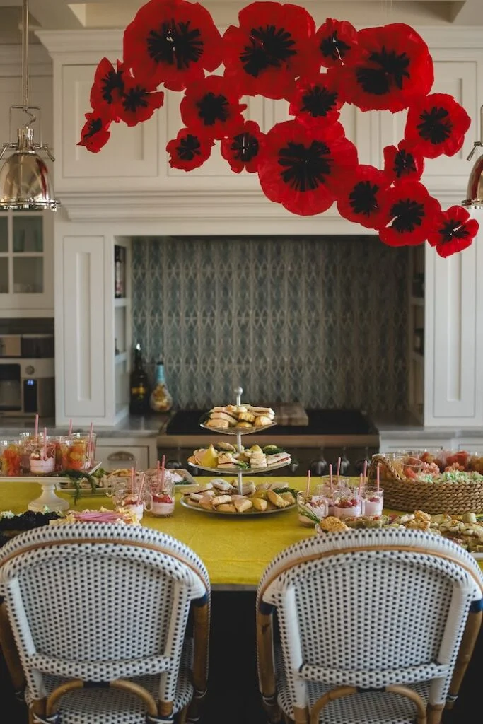 Гирлянда из цветов мака, подвешенная над столом с закусками, стала изящной отсылкой к знаменитой стране Оз. Этот элемент декора добавил аутентичности и волшебства всему оформлению.