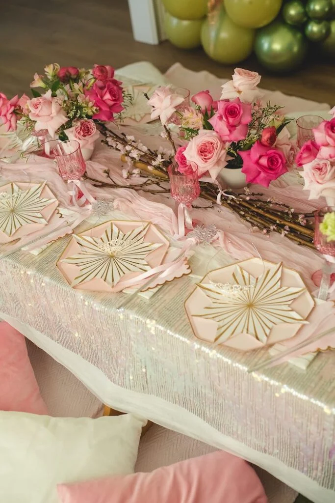 Праздничный стол стал центральным элементом торжества. Он был разделён на две зоны: розовую и чёрно-зелёную, каждая со своим уникальным оформлением.