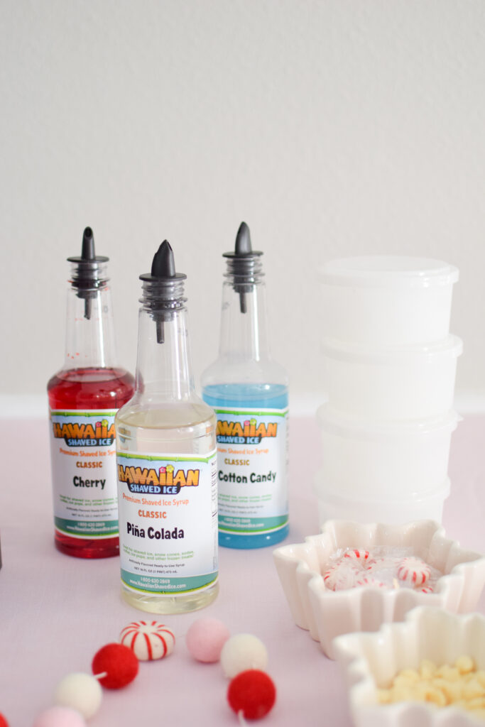 Но просто лёд есть невкусно, поэтому нам понадобятся сиропы и посыпки! Организуйте стойку с бутылочками сиропа с любимыми вкусами и добавками, например, мятными хрустящими конфетами, кокосовой стружкой и шоколадной крошкой. Возможности безграничны. Дети с удовольствием будут украшать свои угощения!