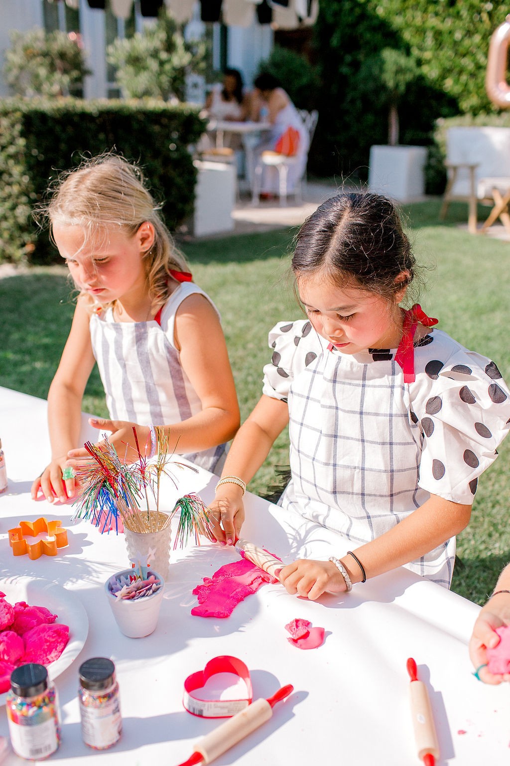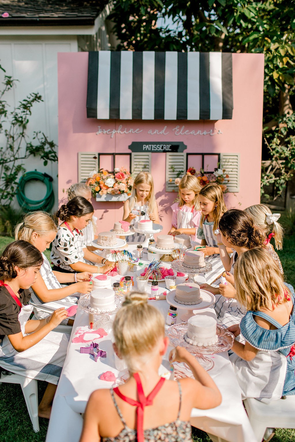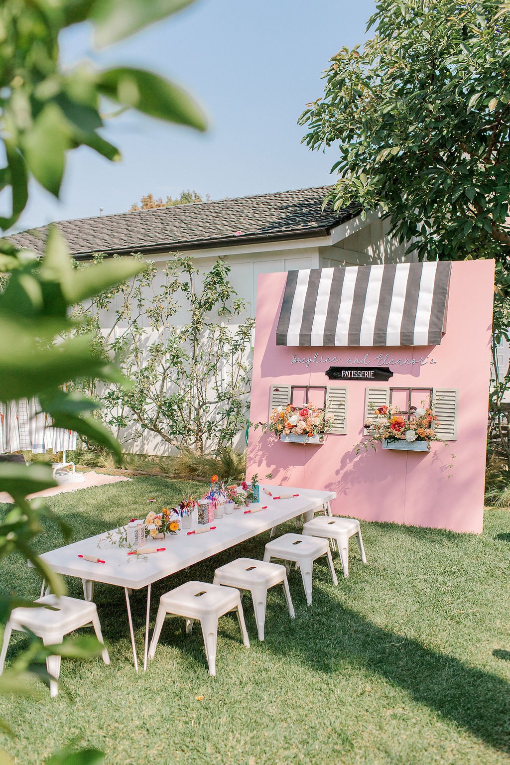 Bonjour, сладкие булочки! У нас тут невероятно стильный праздник в стиле французской кондитерской! Это была совместная вечеринка двух сестер, которым исполнилось 7 и 8 лет. На ней каждая гостья должна была украсить свой собственный тортик, который потом можно было забрать домой и угостить семью! Как вам идея такой пекарни? Все начинается с красивых пригласительных, в которых гостям рассказали о тематике вечеринки, что надеть и чем они будут заниматься! В такой же стилистике было изготовлено печенье, ну и, конечно же, весь декор вечеринки! Добро пожаловать во французскую пекарю! Достаточно простого фона из картона, чтобы ваш двор на даче или около дома преобразился! Он создает атмосферу, а еще украсит любые фотографии. Здесь к созданию подошли основательно: стену сделали из листа древесины, добавили окна и даже кашпо с цветами! Вторая такая деревянная ширма украсила зону бассейна шариками — дети такое просто обожают! Несмотря на то, что вместо стульев были мягкие подушки, стол был не простой из деревянных поддонов, а изысканный, резной, украшенный черно-белой посудой с серебряными акцентами! Внутри дома стоял еще более прекрасный комод, выполнявший роль сладкого стола — тут были угощения и два тортика именинниц! А в ящиках его стола были живые цветы! На этом не менее стильном стелаже стояли заготовки для гостей — маленькие белые тортики на кейкстендах. Как раз на фоне фасада кондитерской для девочек накрыли отдельный стол с мастикой, посыпками, маленькими скалочками и другими вещами, необходимыми для маленьких кондитеров. Девочки увлеченно вырезали украшения из мастики, щедро посыпая поверность тортиков присыпками или выкладывая из них аккуратные узоры. Вот такие DIY-занятия просто необходимо проводить на детских праздниках! Во-первых, они успокаивают непосед и дают отдохнуть родителям. Во-вторых, развивают воображение, мелкую моторику и другие творческие черты характера! А в-третьих, дети потом очень рады насладиться результатом своего труда, подарить поделки родителям и выслушать похвалу! Посмотрите, какая красота! Такой мастер-класс легко устроить на своем празднике — достаточно заказать заготовки и закупить украшения для тортиков. Попробуете? Источник: 100layercake.com
