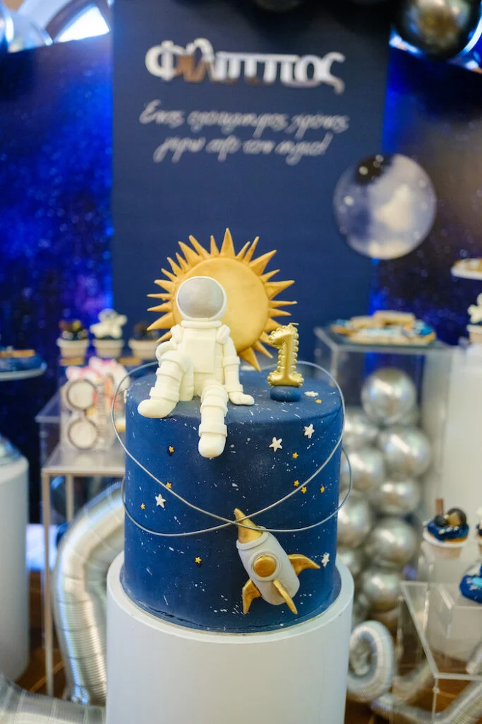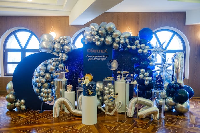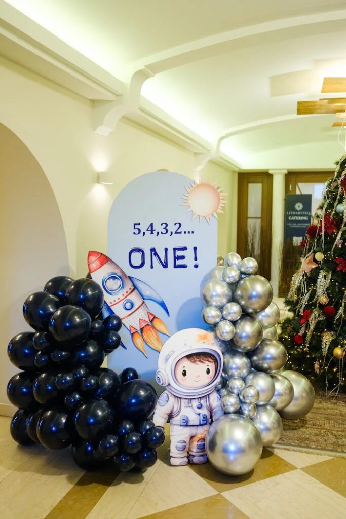 Наши зарубежные коллеги из Греции устроили незабываемый праздник по случаю первого дня рождения мальчика. Торжество получилось по‑настоящему космическим и волшебным. На входе гостей встречала восхитительная композиция с воздушными шарами, маленьким космонавтом и забавным отсчётом от 5 до 1 — именно столько исполнилось имениннику. Проходя в зал, каждый сразу погружался в атмосферу межзвёздных приключений.