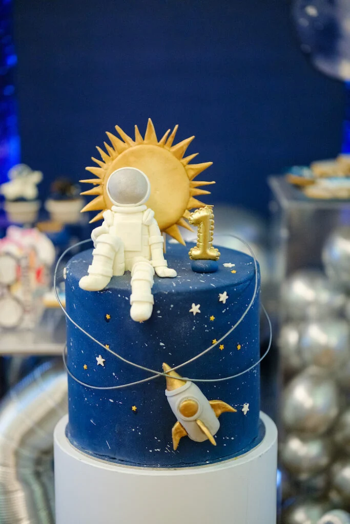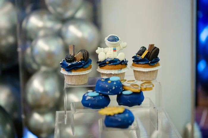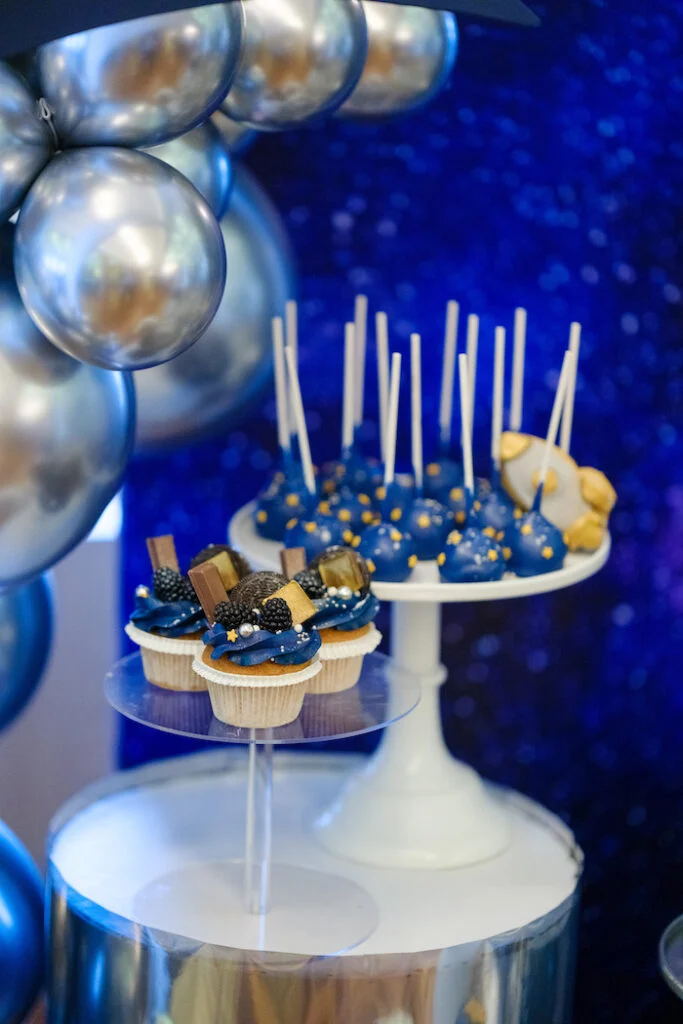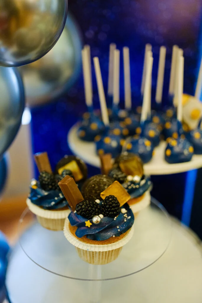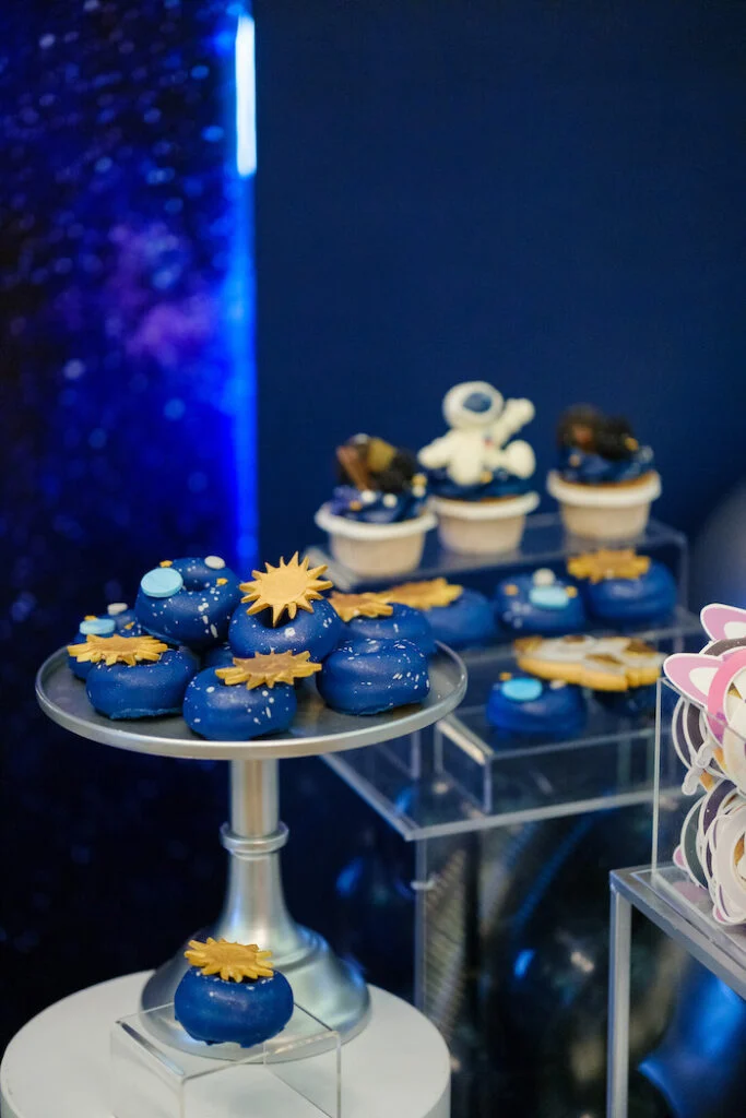Помимо торта, гостей угощали нежными капкейками, утончёнными макаронс, забавными кейк‑попсами и печеньем, выполненным в космическом стиле. Каждое лакомство было не только вкусным, но и визуально привлекательным.