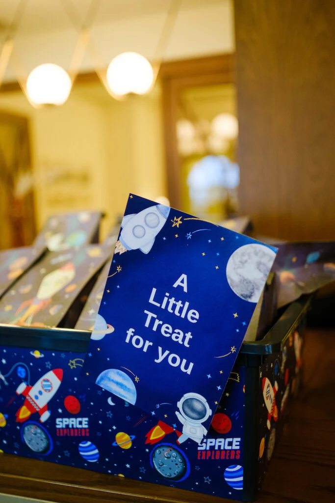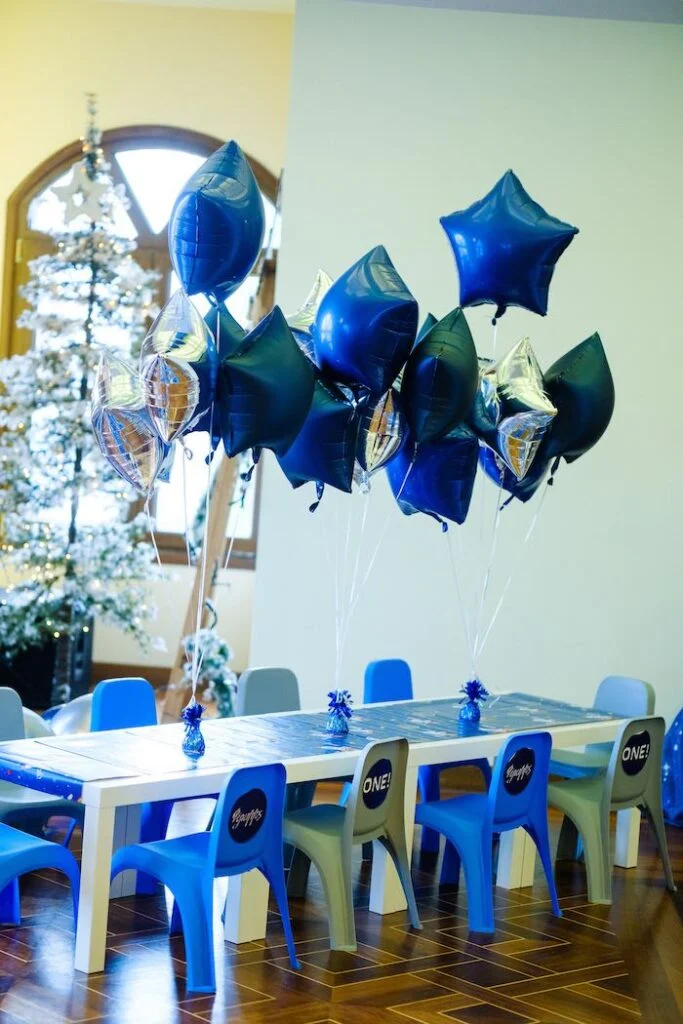 Каждый элемент декора работал на создание целостной космической истории. Синие оттенки в сочетании с серебряными акцентами создавали ощущение звёздного неба. Воздушные шары разных размеров добавляли объём и динамику пространству. Даже мелочи, вроде салфеток и посуды, были подобраны с учётом общей концепции.