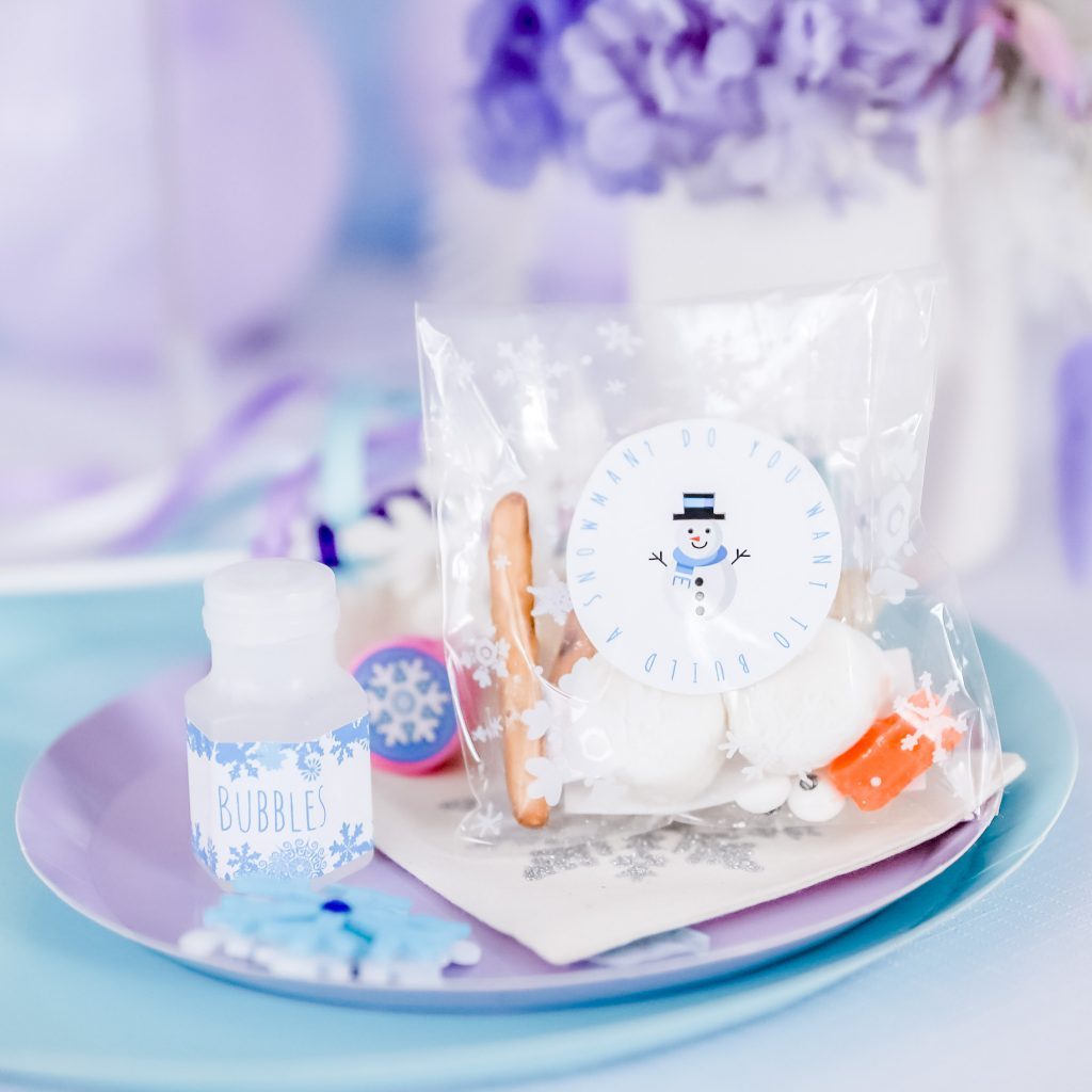 Кстати, обычно к сервировке добавляют небольшие подарки для гостей. Здесь девочки получили волшебные палочки и чудесные мешочки со сладостями, украшенные блестящим принтом со снежинкой и именем гостьи.