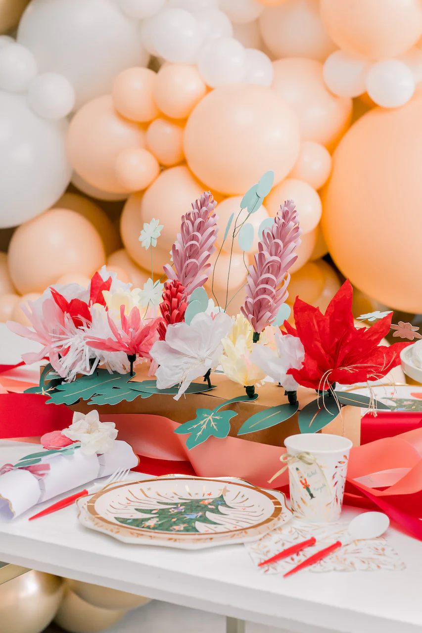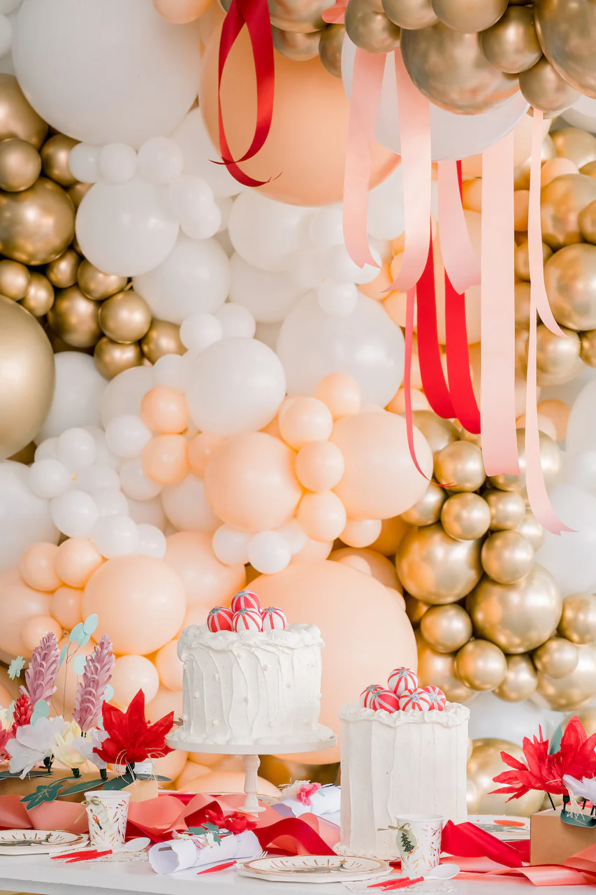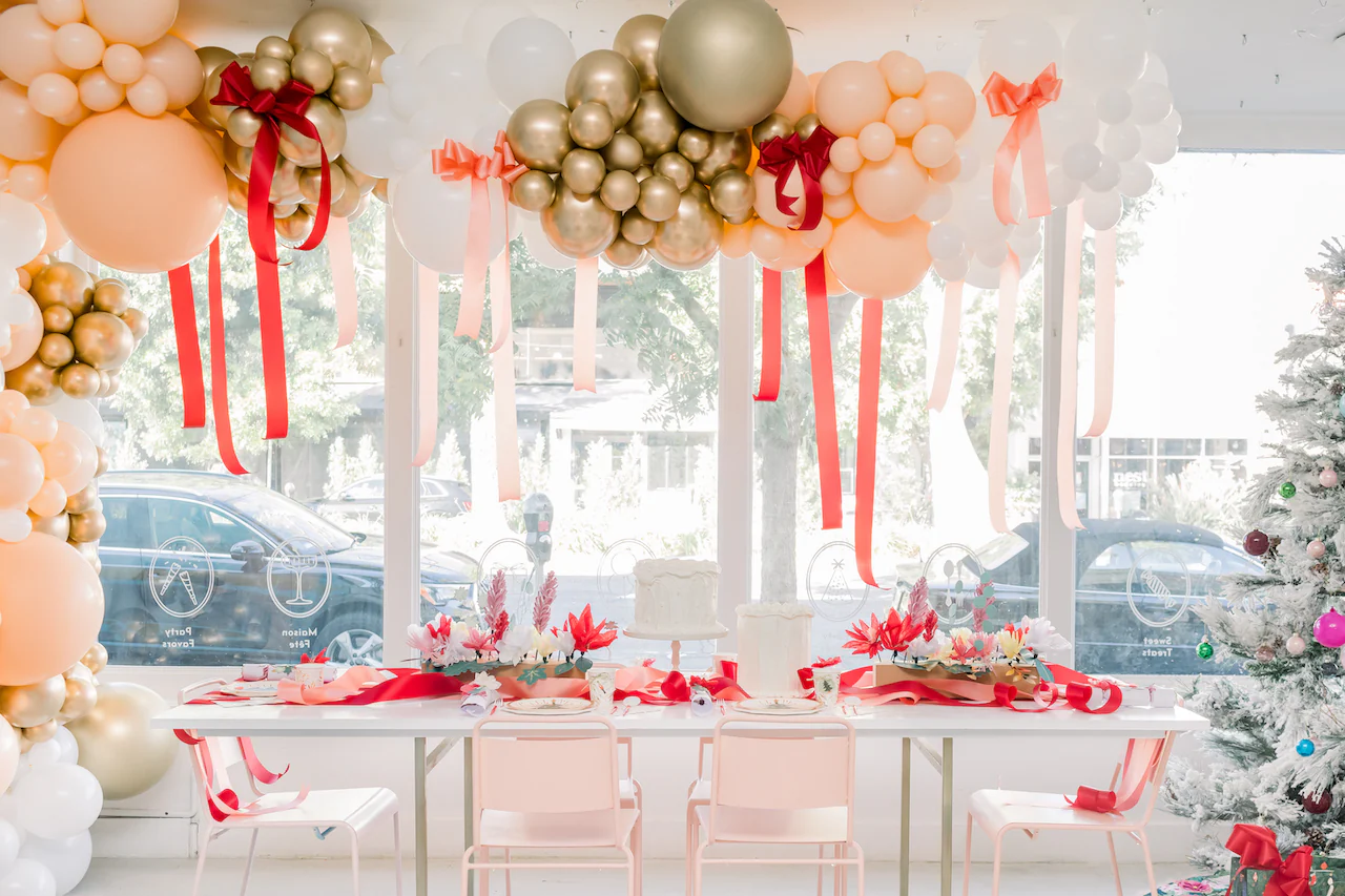 Эта вечеринка в стиле «Щелкунчик» потребует много нейтральных рождественских украшений с несколькими штрихами красного тут и там. А ещё понадобится праздничная гирлянда из воздушных шаров в персиковых, белых и золотых тонах. Чтобы придать ей немного яркости, завяжите по всей длине несколько атласных красных и розовых бантов.