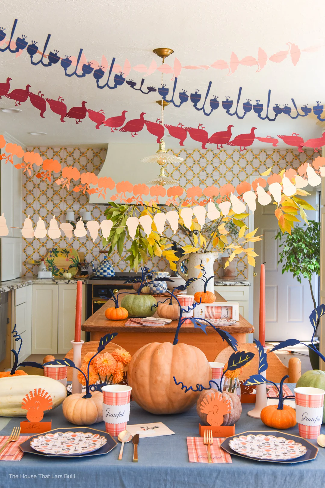 Осенние листья из бумаги можно разложить по краям скатерти или сделать из них гирлянды. Тыквы-соты добавят столу оригинальности, но можно использовать и настоящие тыквы разных размеров! Не забудьте про жёлтые и красные шары, которые создадут праздничное настроение.