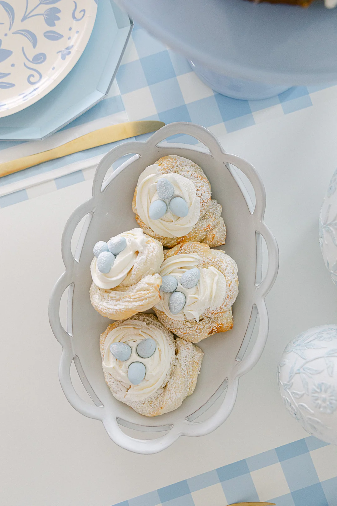 - Выдавите на каждое гнездо немного крема с помощью кондитерского мешка, украсьте их маленькими шоколадными яйцами и посыпьте сахарной пудрой.