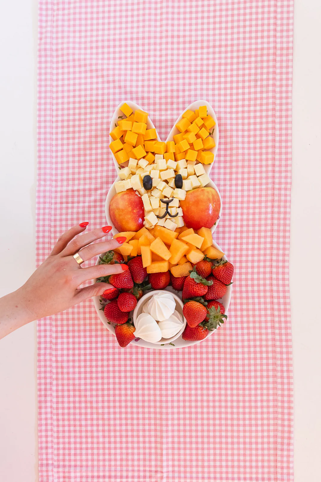 Эта более традиционная закусочная тарелка с фруктами и сыром отлично подойдет детям, взрослым и всем без исключения! Для этого вам понадобится тарелка в форме кролика, но можно выложить его и на подносе или плоском прямоугольном блюде.