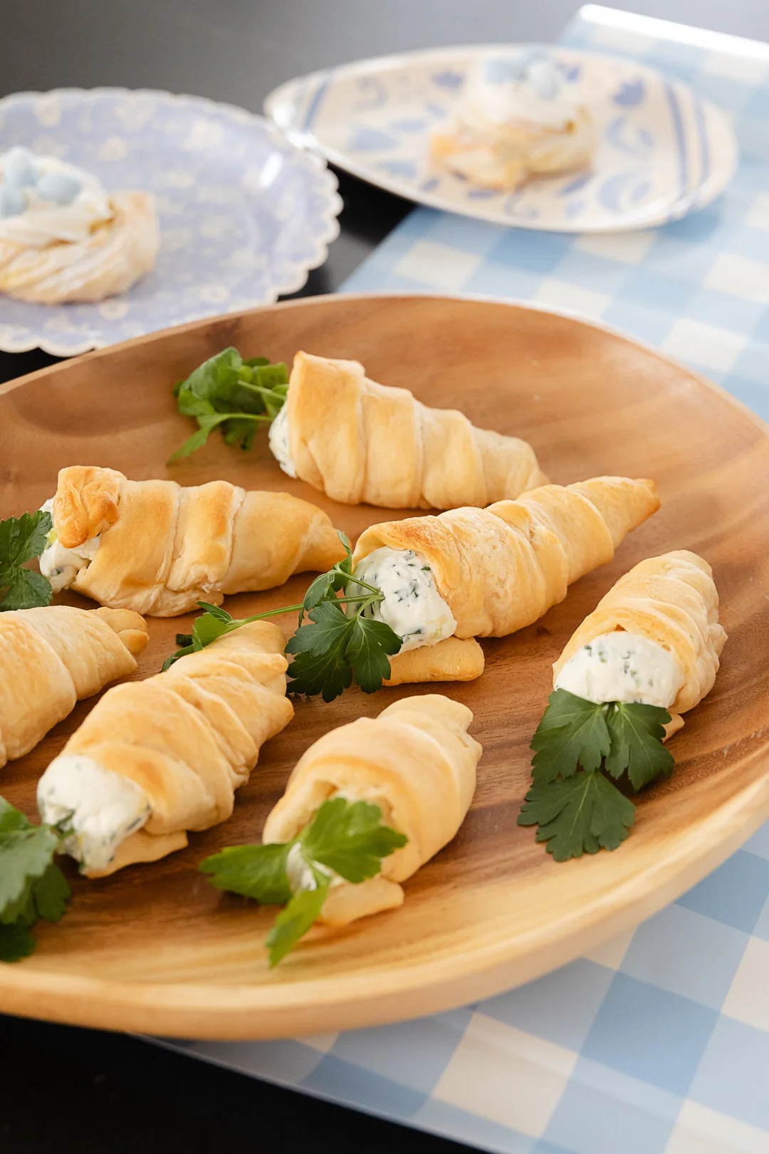 - Выложите или выдавите ложкой смесь из сливочного сыра в каждый рожок и украсьте двумя веточками петрушки, чтобы завершить образ морковки!