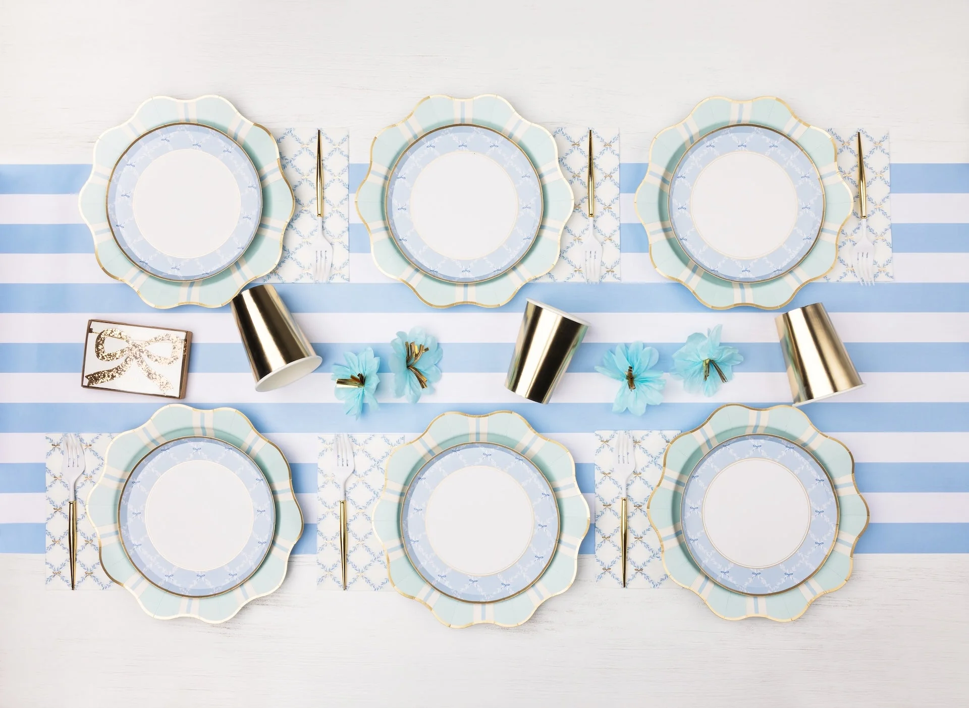 К розовому или голубому празднику подойдут золотые акценты, сделав оформление более торжественным! Это может быть что-то из посуды, столовые приборы, золотое конфетти или гирлянда.
