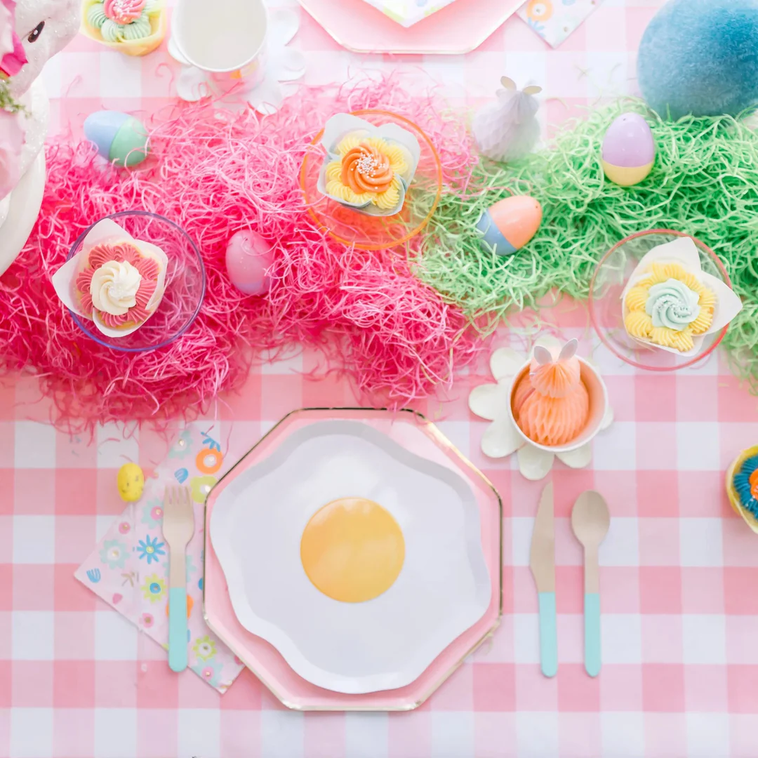 Нам понравилась эта милая композиция в центре стола из наполнителя для подарочных коробочек. Декораторы разложили наполнитель разноцветной змейкой и положили декоративные яйца то тут, то там. Нам особенно нравится клетчатая розовая скатерть, на которой так здорова смотрелась посуда и столовые приборы. Вот по-настоящему пинтерестное оформление! Тарелочки от Meri Meri и столовые приборы тоже.