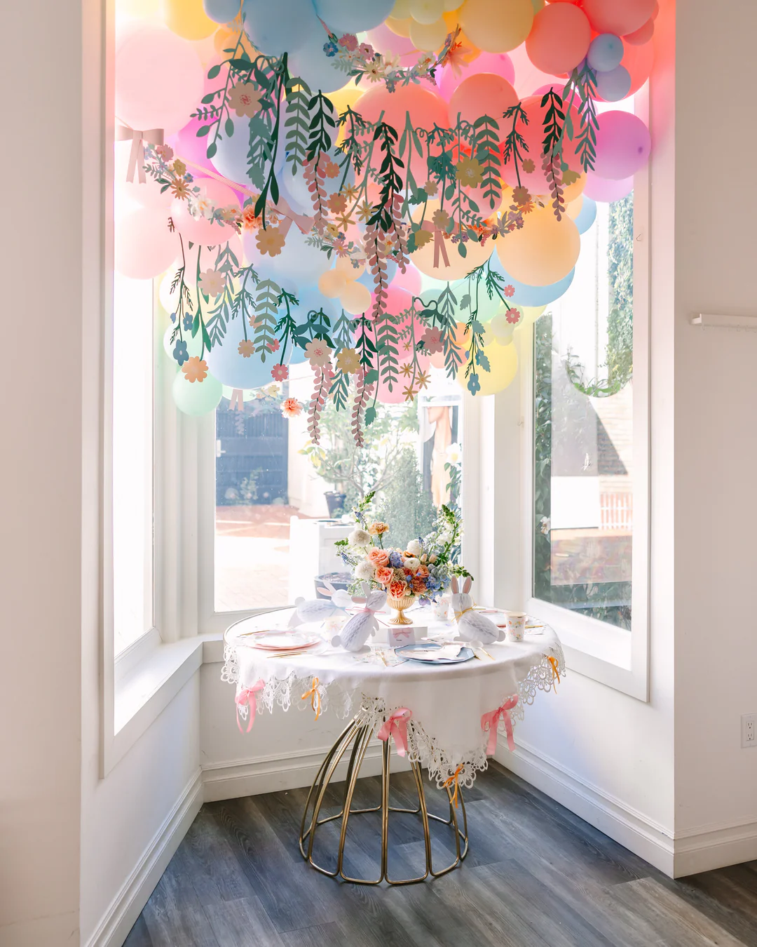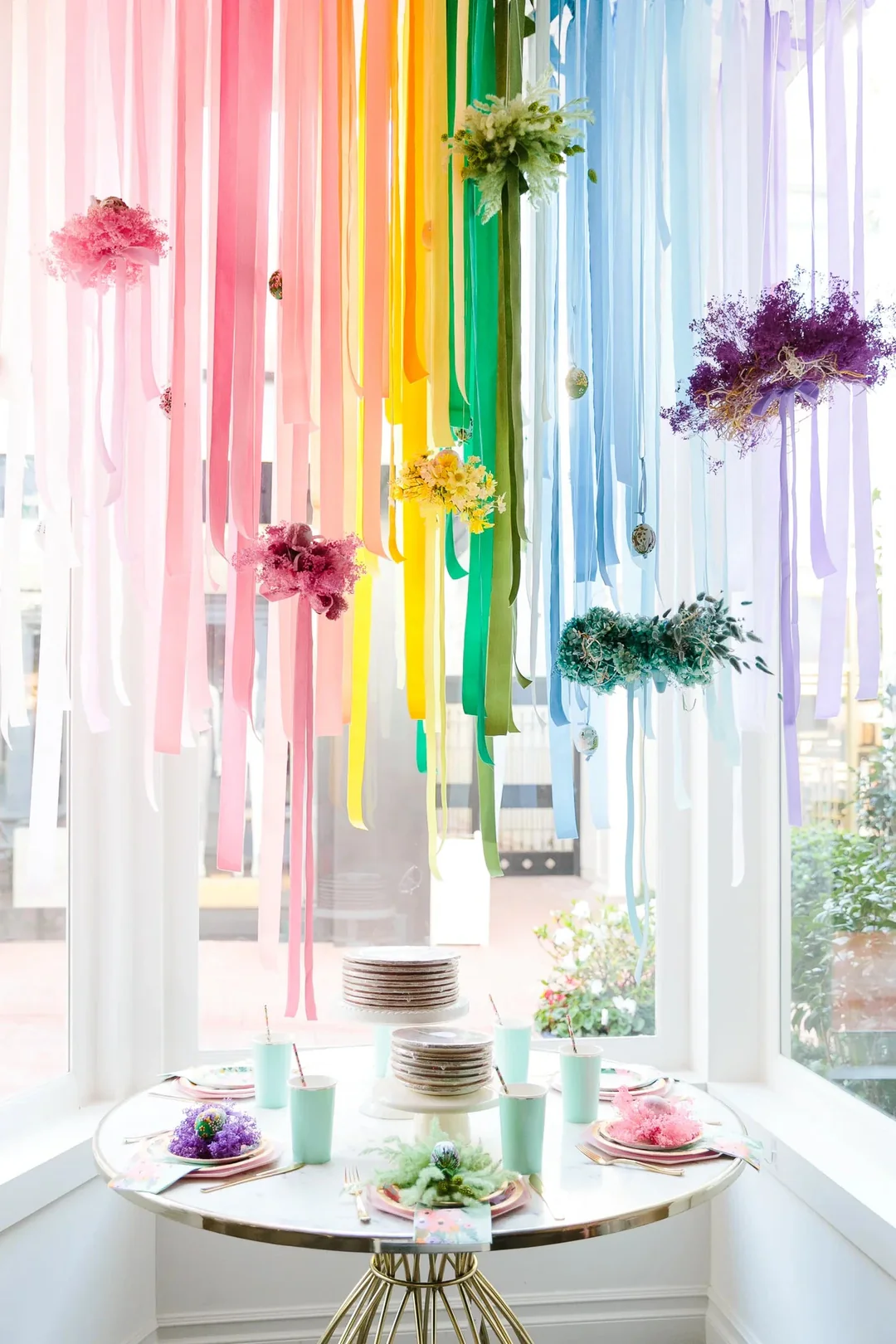 Бантики — тренд последниз двух лет, и на Пасхе они тоже будут в тему! Посмотрите, как здорово сочетается эта гирлянда с обилием свежих цветов.