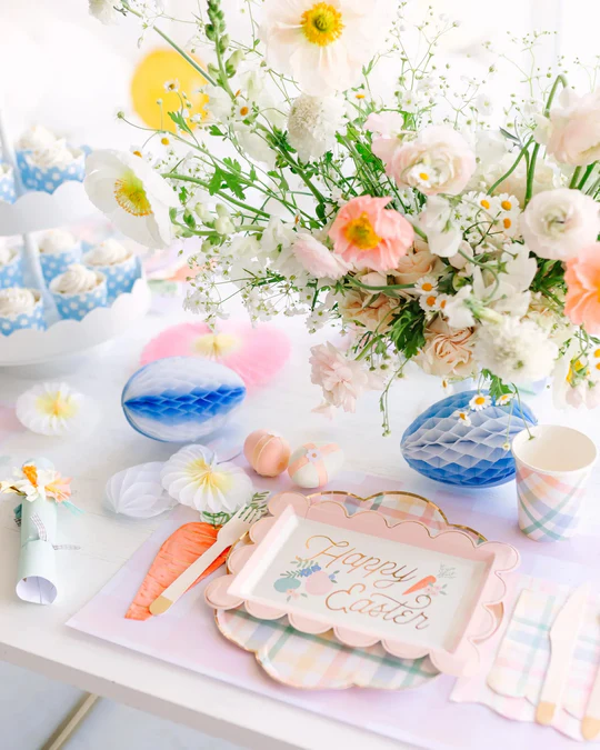 Пастельная клетка идеальна для пасхальной сервировки, но мы ещё хотим посоветовать... морковки! Вы можете взять для сервировки наши салфетки, но ещё круче будет положить красивую яркую морковь на стол, дополнив ботвой (мы делали её из петрушки на одном из домашних праздников). Советуем вам стаканы в клетку и тарелочки.