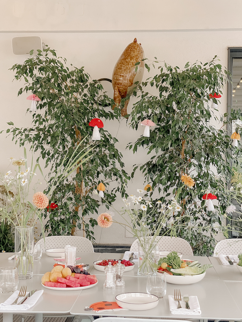 Эта история о том, как мы сделали настоящий лес в ресторане KM20! А ещё о том, как мы познакомились со всеми подрядчиками за день до праздника, но смогли создать единую концепцию. Наша клиентка была за границей, так что мы познакомились с аниматорами, флористами и другими подрядчиками в самый последний момент, а на нас лежала сложная задача создать единую концепцию, работая с другими людьми. Этот проект был сложным не по дизайну, а по организаторским моментам, но у нас всё получилось. Визуальной связующей был декор Мери Мери из новой коллекции, клиентка привезла его из Франции специально для этого праздника. Мы взяли его, сделали кастомный декор в таком же стиле, а затем помогли флористам грамотно вписать цветы и зелень в нашу идею. У нас было три зоны, первая — Party. Здесь гостей встречала милая композиция из разноцветных детских матрасов — они служили просто украшением. Рядом стояла вешалка с костюмами Meri Meri, в которые наряжали маленьких гостей. А стрелка указывала на веранду, где стояли столы для детей и взрослых. У ресторана была своя посуда, к которой мы добавили волшебные салфетки в форме грибов и божьих коровок. Так мы впустили немного леса и в сервировку, а ещё используя букеты цветов и яркие фруктовые тарелки. Флористы собирали цветы и травы в поле накануне праздника! Был настоящий лесной мох и земля, всё это украсило веранду по периметру — посмотрите, какой волшебный эффект был достигнут! Вторая зона — театр. Акварельные декорации нарисовала художница специально для праздника, мы скинули ей принты Мери Мери для вдохновения. В итоге её рисунки идеально вписались в наш праздник! Среди этой красоты ставили спектакль Дюймовочка. Третья зона — мастер-классы. Мы отделили её лентами стримерс, на столы расставили букеты и добавили необычные бумажные цветы. Здесь, в окружении полевых трав и цветов, дети мастерили поделки, пока родители общались за столом. Мы грамотно разделили пространство, чтобы никто никому не мешал. Это настоящий лесной мох, который дополнили тарелочки-грибы из лесной коллекции Мери Мери! Нежный бумажный декор гармонично сочетался с живыми растениями. Мы знаем, как создать волшебную сказку, и с радостью сделаем необычный праздник и для вас!