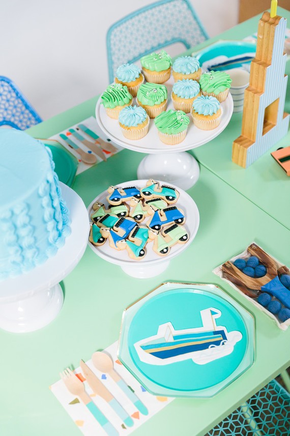 Доброе утро, мамочки! Команда 100 Layer Cakelet создалаочередной стильный день рождения для мальчика! Он был оформлен в веселой городской теме с печеньками-мопедами и городскими кварталами. Основными цветами были зеленый и голубой с теплыми акцентами: желтые блики на домах, персиковые шарики в гирлянде. Оформление получилось одновременно и очень взрослым с его геометрическими формами и минимализмом, и детским — стол украшали деревянные домики и машинки! Особенно привлекали внимание крутые железные стулья! На мятных столиках без скатерти разложили нейтральную посуду от Meri Meri в цветах праздника — красивую комбинацию из мятных многоугольных тарелочек и круглых бирюзовых. И у каждого мальчика возле тарелки лежала очаровательная рогатка в ретро-стиле! В празднике вообще было очень много ретро-мотивов, взять хотя бы модельку машинки или деревянный конструктор в виде города. Угощения были в той же гамме, что и весь декор — синие, бирюзовые и зеленые печеньки и такие же капкейки с шапками цветного крема. Источник: 100layercakelet.com