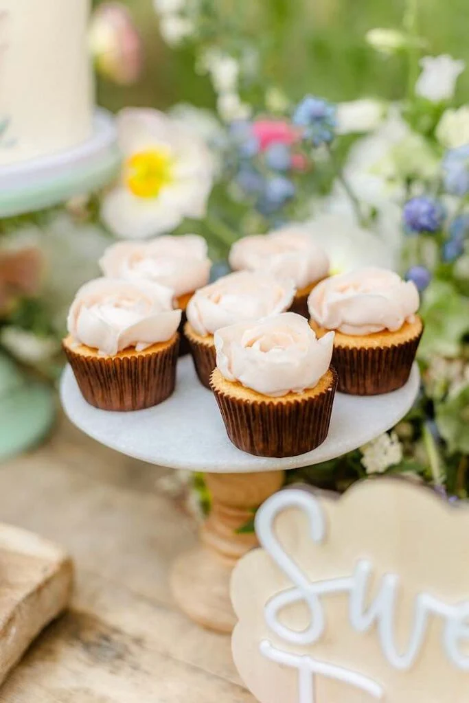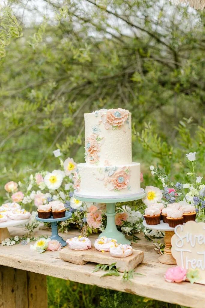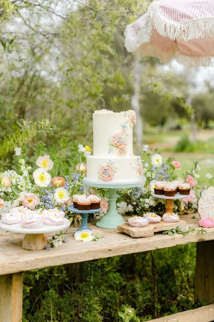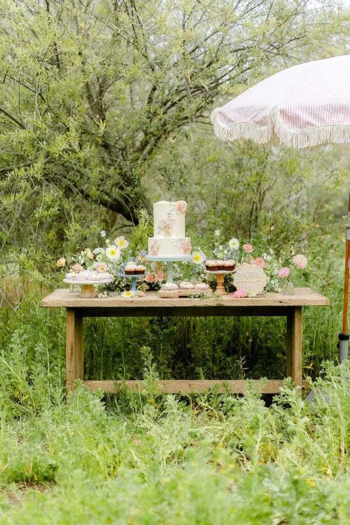 Сбоку от обеденного стола расположился винтажный сладкий стол из неокрашенного дерева. Стоя прямо в траве, он казался частью природы и гармонично вписался в пейзаж. Его украшали множество букетов и огромная цветочная композиция, а среди угощений — тематические десерты с пасхальными мотивами.