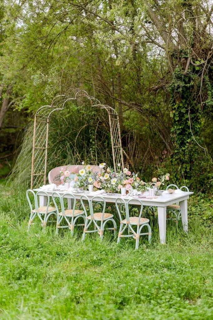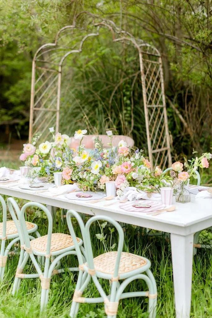 В центре композиции — простой белый стол и милые стульчики с плетёными элементами: минималистично, нежно и очень по‑весеннему. По всей длине стола протянулись букеты свежих цветов — они создали живую цветочную дорожку, от края до края.