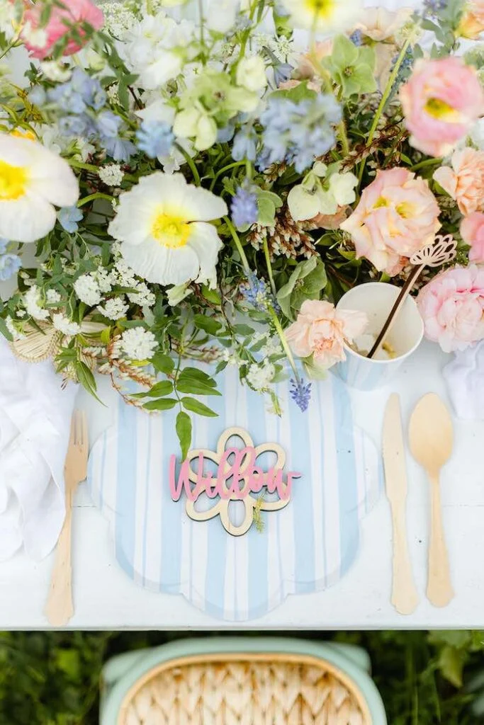 Сервировка получилась лёгкой и непринуждённой: бумажная посуда в пастельную полоску и простые деревянные приборы добавили уюта без лишней торжественности. На каждой тарелочке — акриловая рассадочная карточка с именем: так дети легко находили свои места и чувствовали себя особенными гостями праздника.