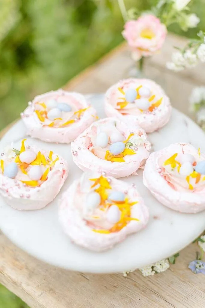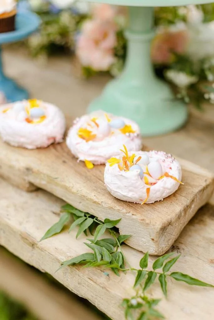 Особенно детям полюбилось безе в виде гнёзд с шоколадными яйцами, украшенными лепестками цветов: вкусно, красиво и по‑настоящему празднично!