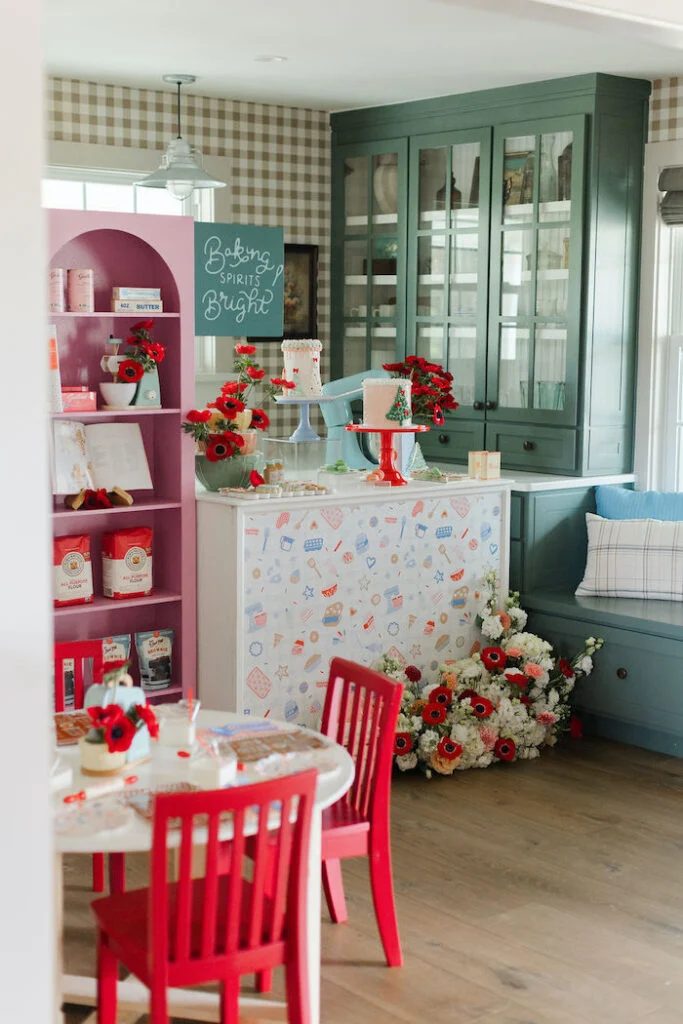 Ярким акцентом оформления стали маки — их яркие лепестки привносили в интерьер живое, праздничное настроение и контрастировали с зимней тематикой. Для юных кулинаров накрыли специальный стол, где они могли подкрепиться между этапами мастер‑класса.