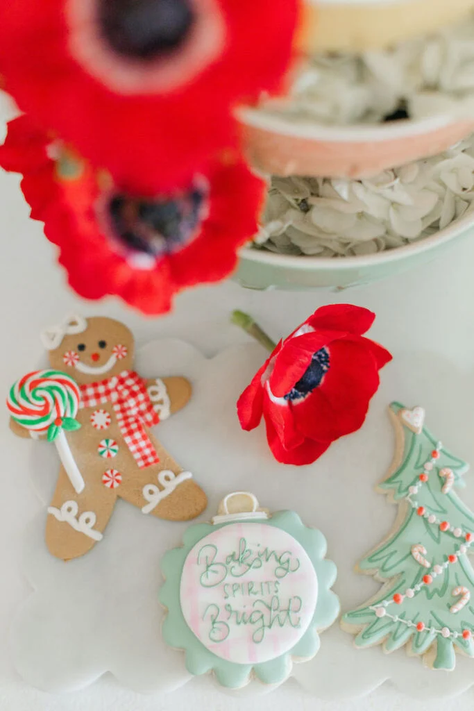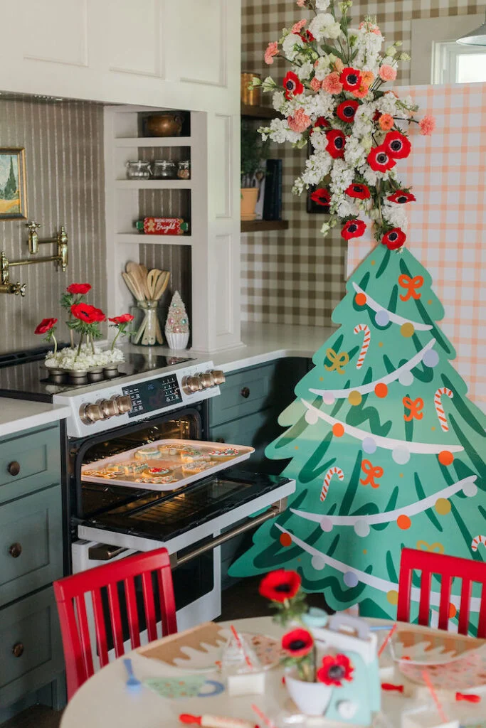 Стол ломился от красивых десертов, а стильная бумажная посуда добавляла сервировке лёгкости и праздничности. После лёгкой закуски девочки с энтузиазмом приступили к главному событию — выпечке новогоднего печенья.