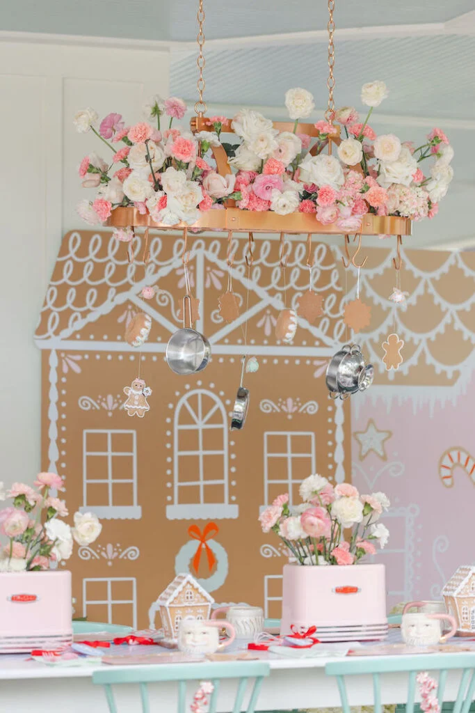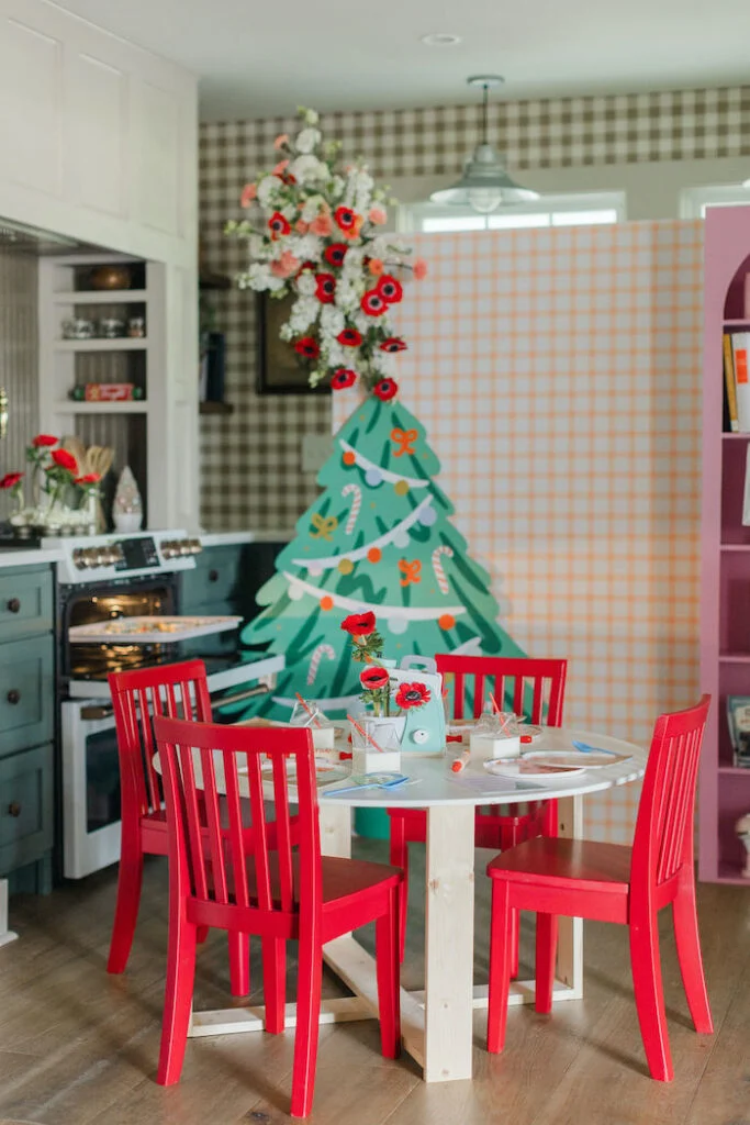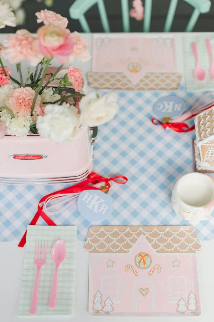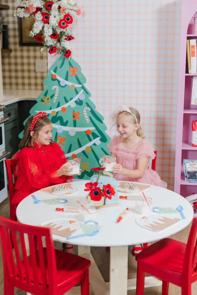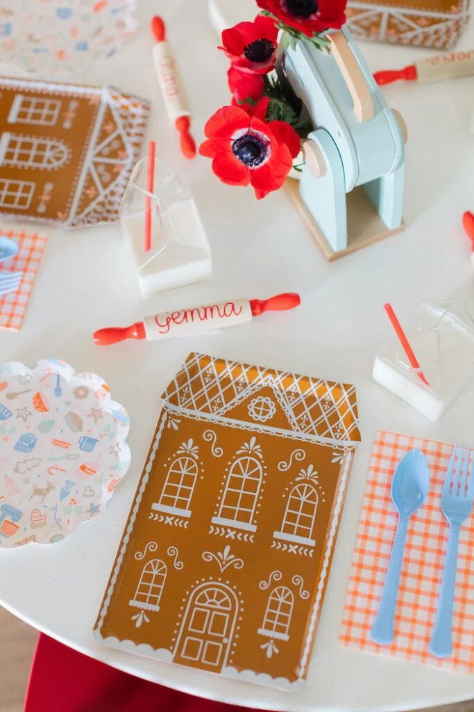 На фоне разместили изящную картонную ёлочку, ставшую живописным фоном для фотосессий. Особую трогательность сервировке придавали маленькие скалочки с именами девочек — оригинальные рассадочные карточки, намекавшие на предстоящие кулинарные подвиги.