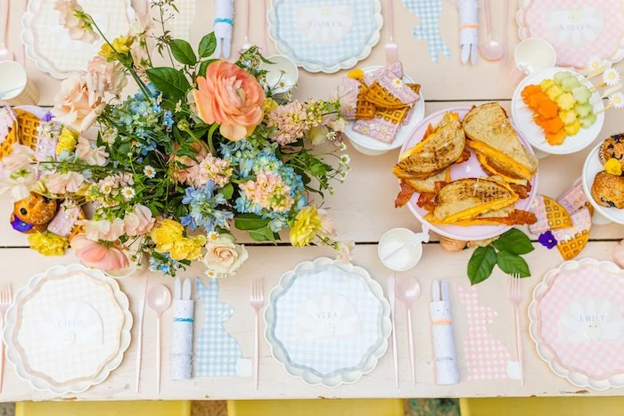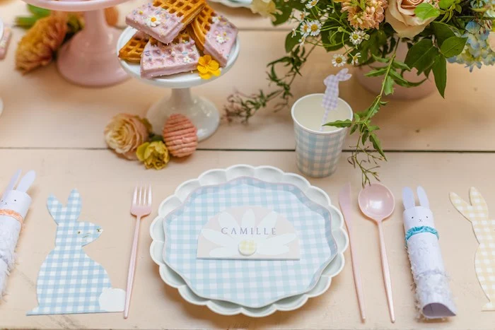 Основа нежной сервировки — посуда Мери Мери. Тут были тарелочки из коллекции Эко, пасхальные в клетку, салфетки-зайчики и милые хлопушки с сюрпризами внутри. Не обязательная деталь, но она не только дополняет сервировку, но и делает детей чуть счастливее.