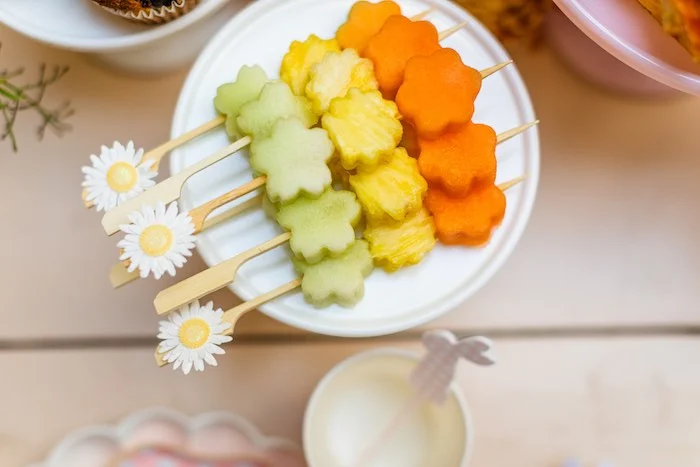 А овощи и фрукты сделали превратили в настоящую красоту, вырезав их в форме цветочков. Такие шпажки заинтересуют любого ребёнка!